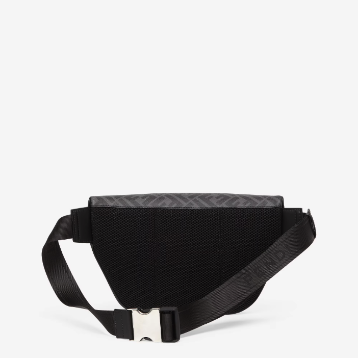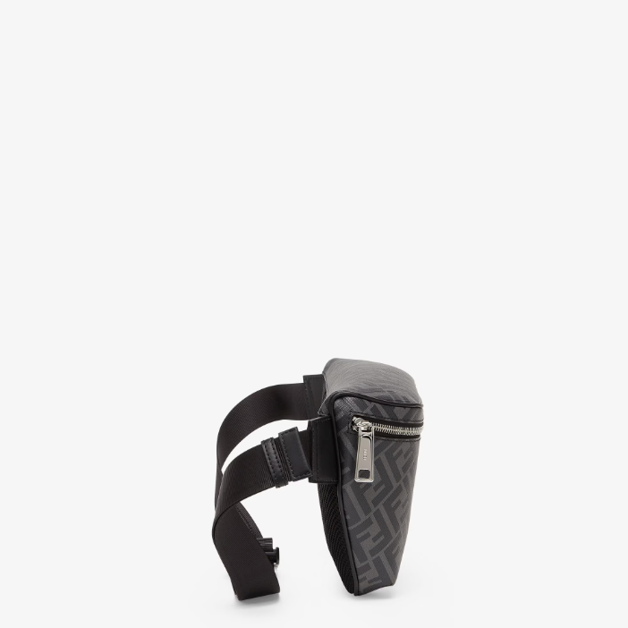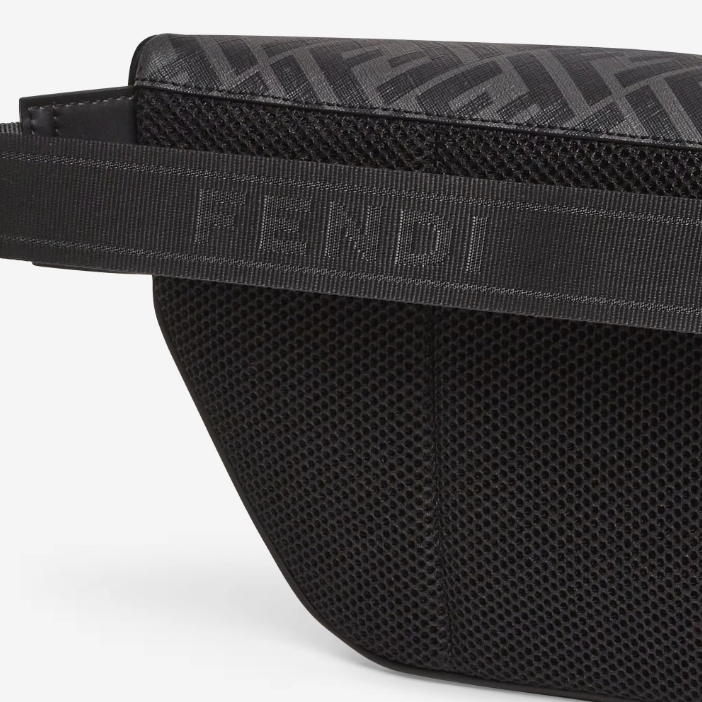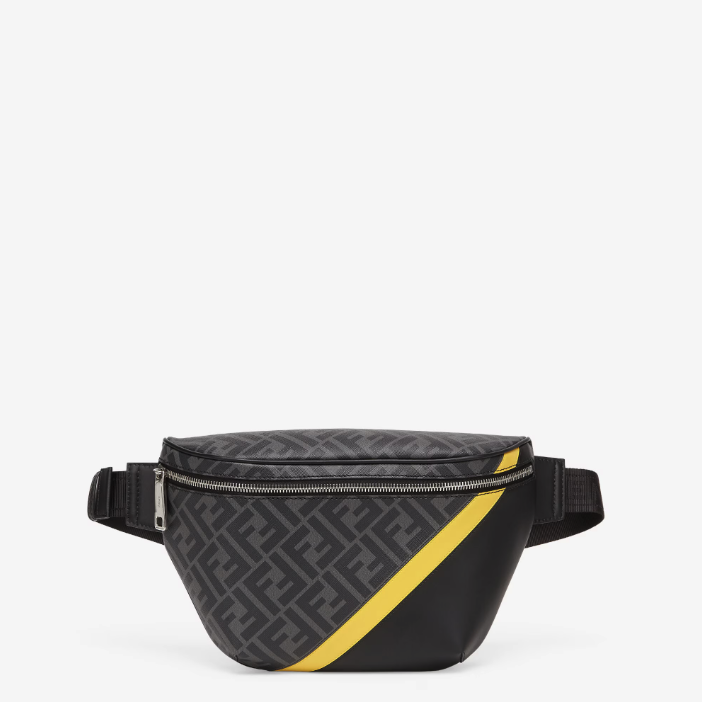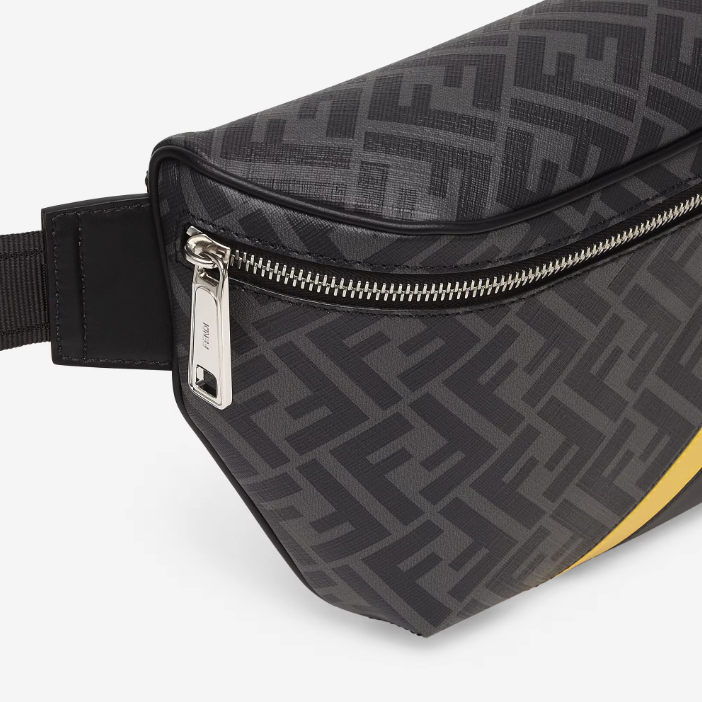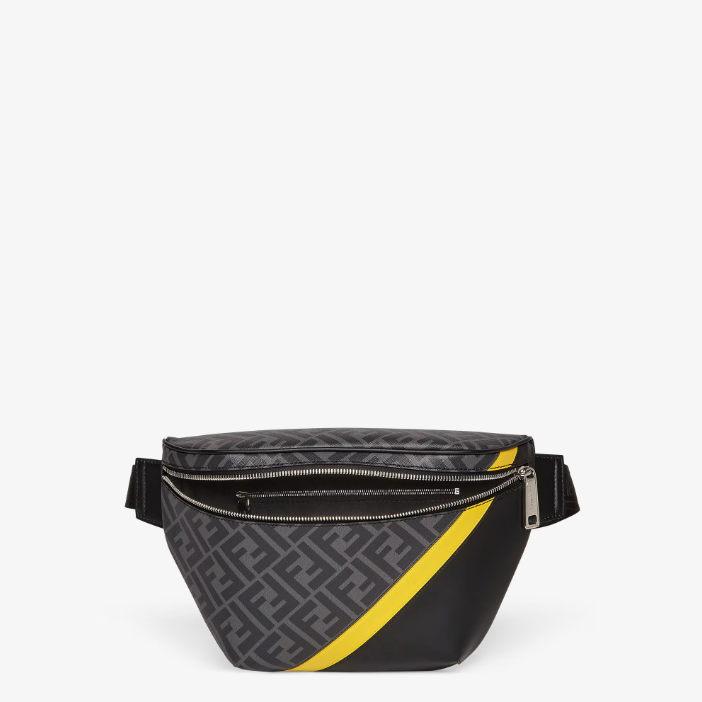 Belt bag with zip fastening. Adjustable belt. Made of textured grey fabric with FF motif. Embellished with black leather insert and yellow inlaid detail. Palladium-finish metalware.