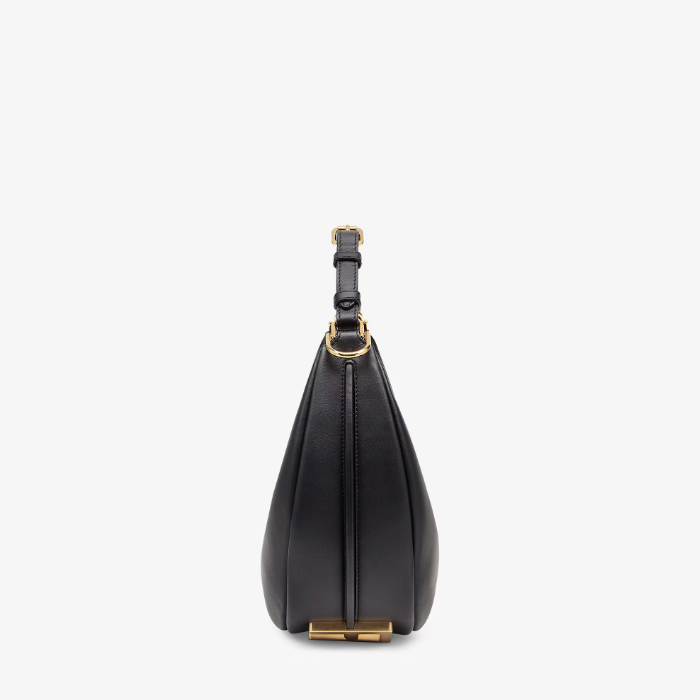 Small hobo bag made of soft black leather, with vintage gold metal FENDI lettering visible when the bag is worn under the arm.