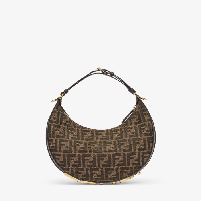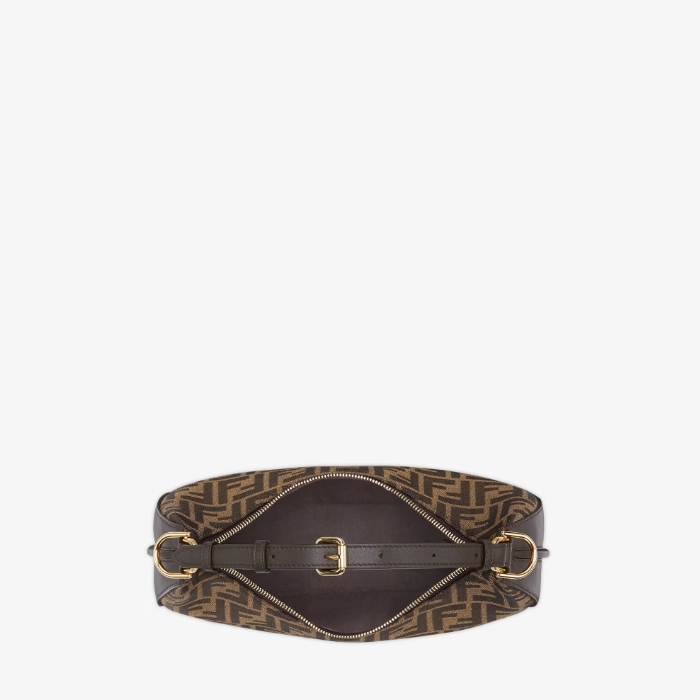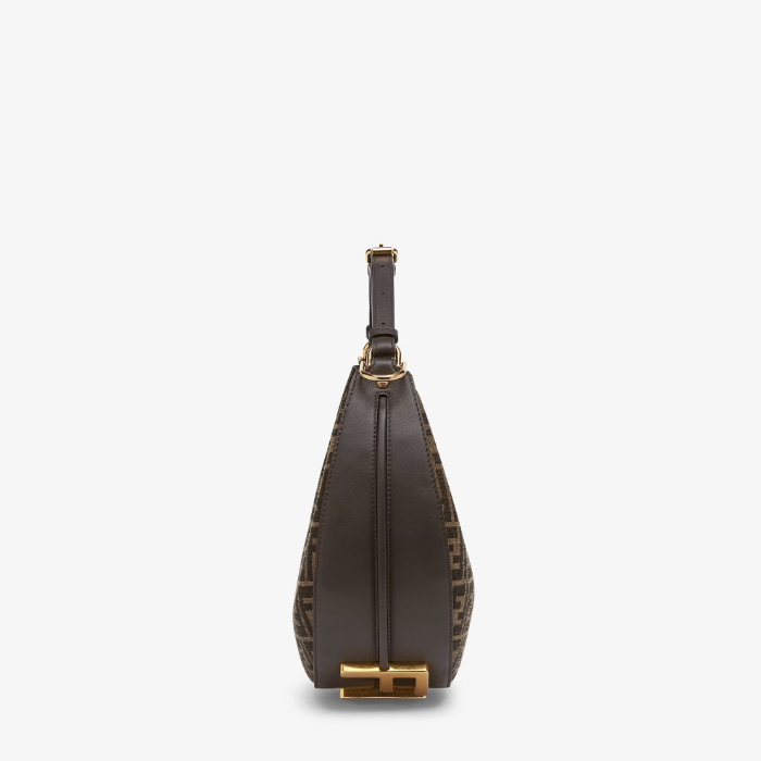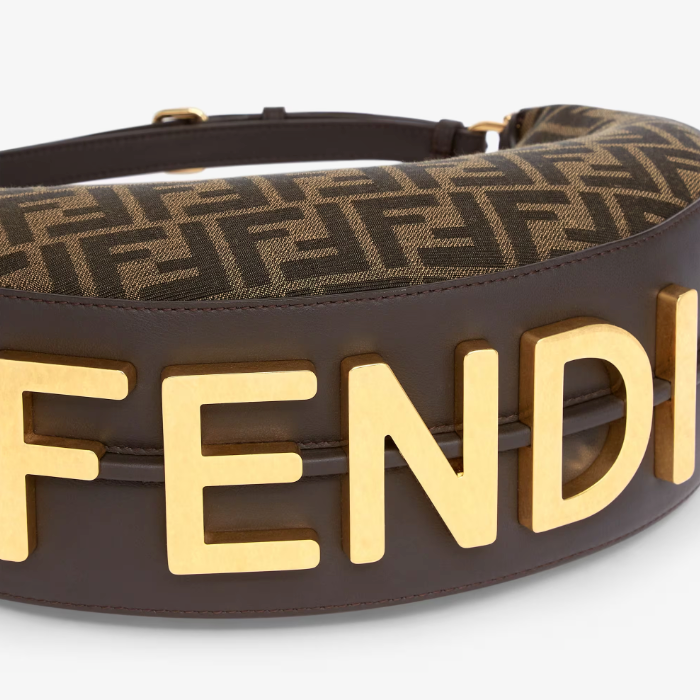 Made of jacquard fabric with the iconic FF motif in brown, decorated with vintage gold-finish metal FENDI lettering on the base, visible when wearing the bag under the arm.