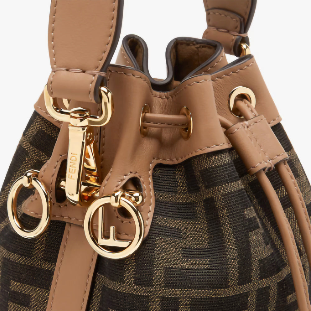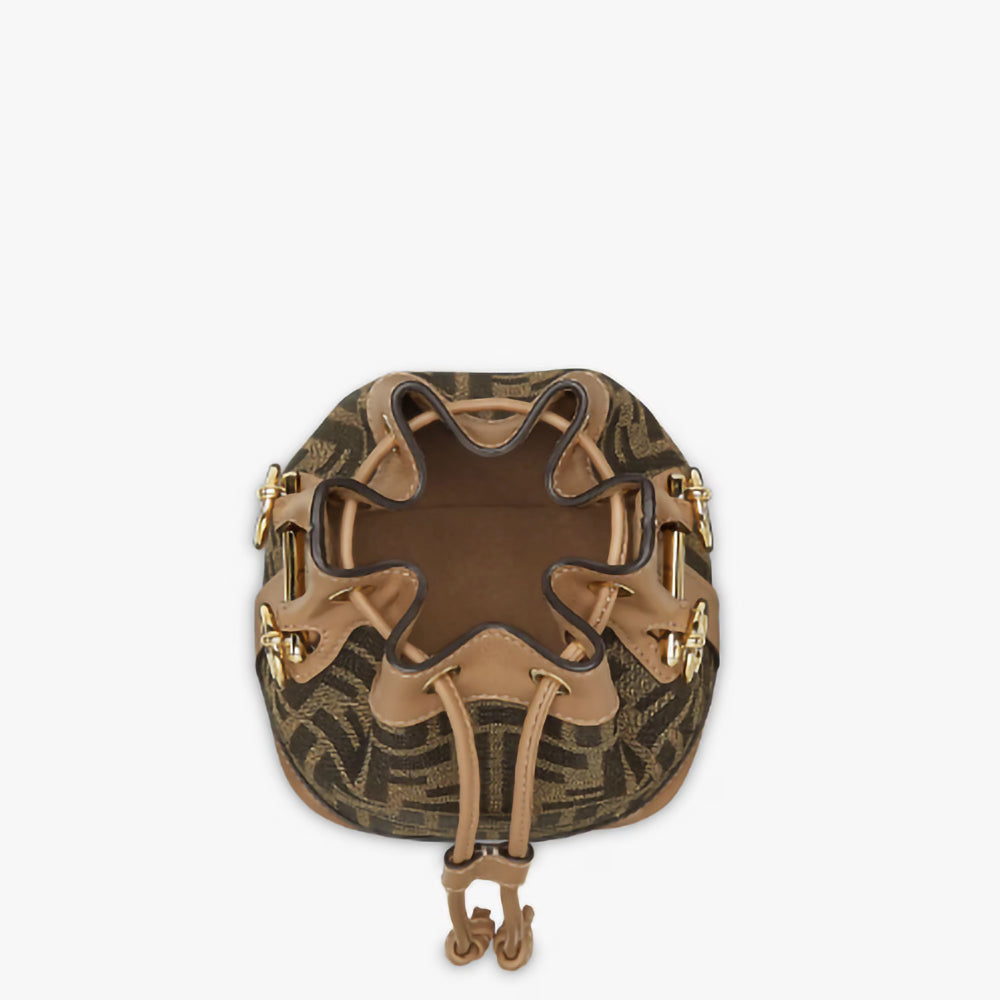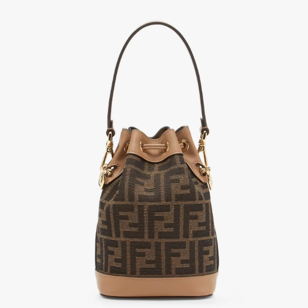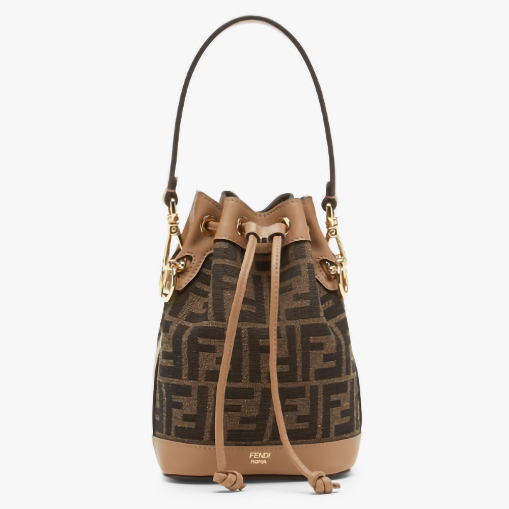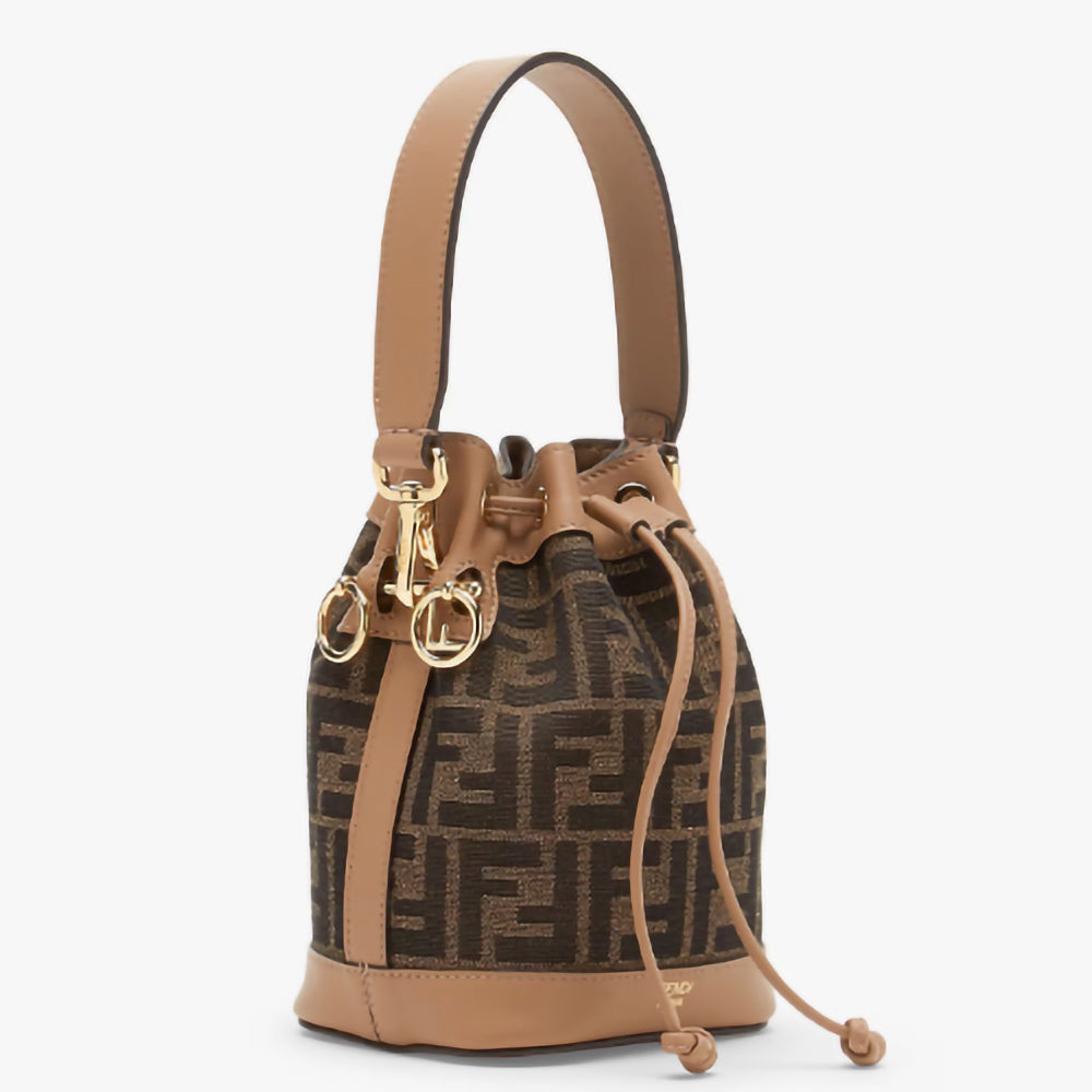 Iconic small Mon Tresor bucket bag with new proportions perfect for always having your everyday essentials close at hand. Made of fabric with brown jacquard FF motif.