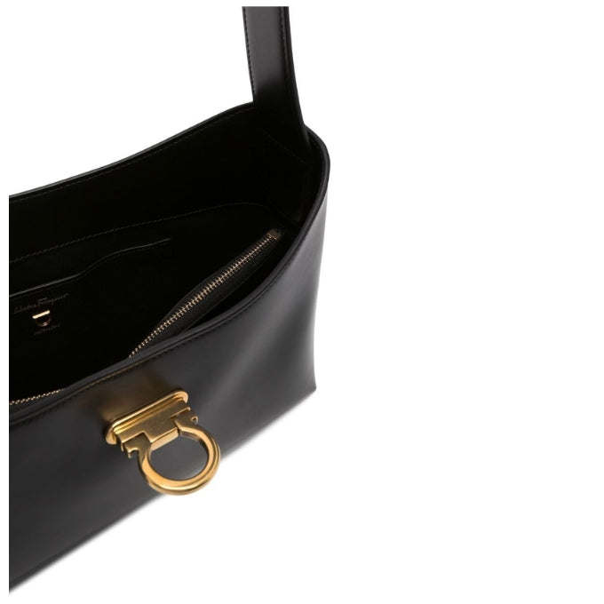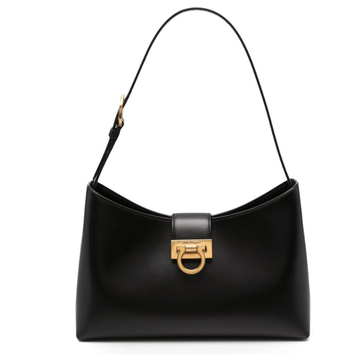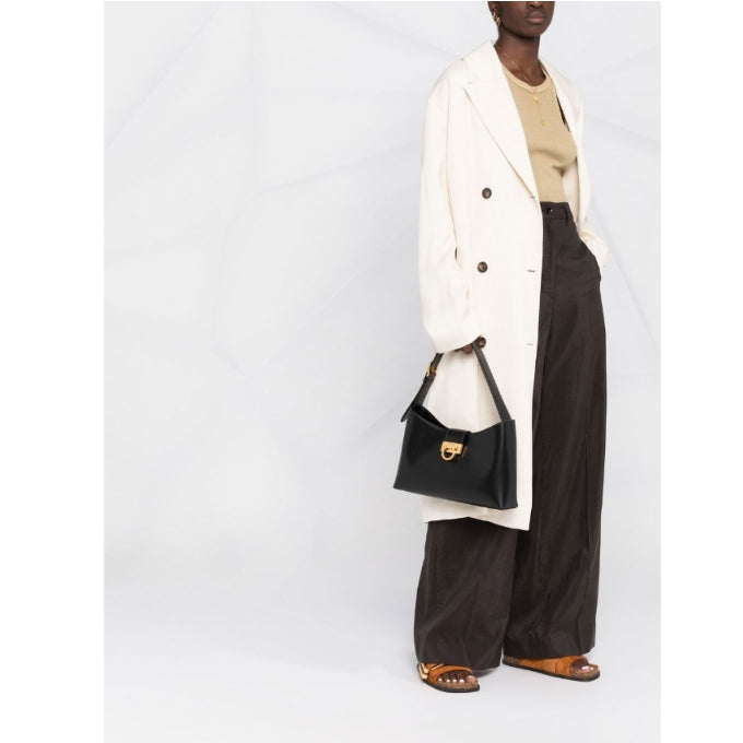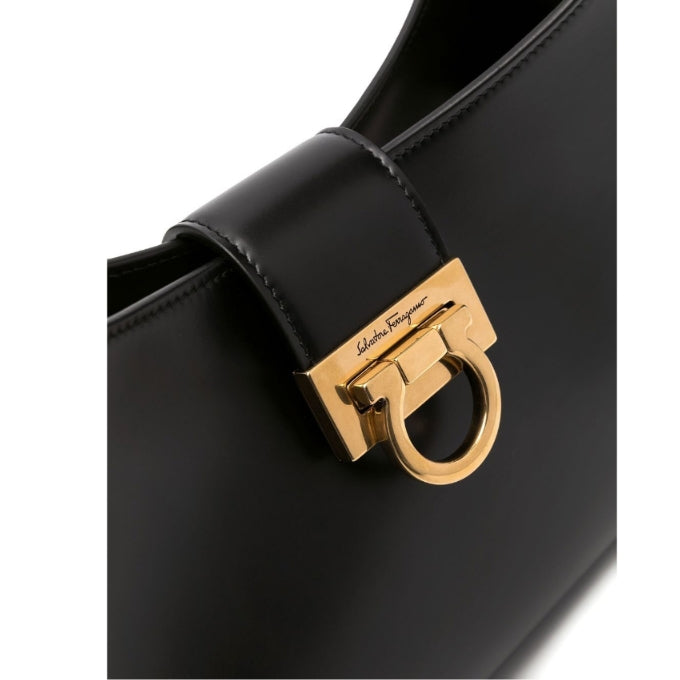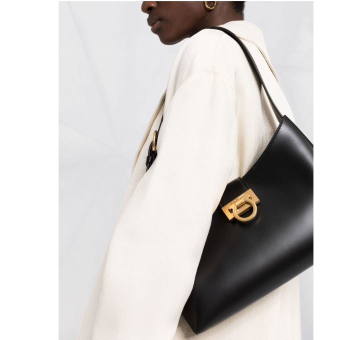 Minimal aesthetics with a feminine twist: the Trifolio line has a new member. The geometric shapes and the soft matte-finish calfskin draw clean lines, completed by the golden Gancini clasp in an antiqued finish. The interior is organized with two compartments and a central zip pocket, for perfect organization of your essentials. Adjustable tonal leather strap, with Gancini buckle.