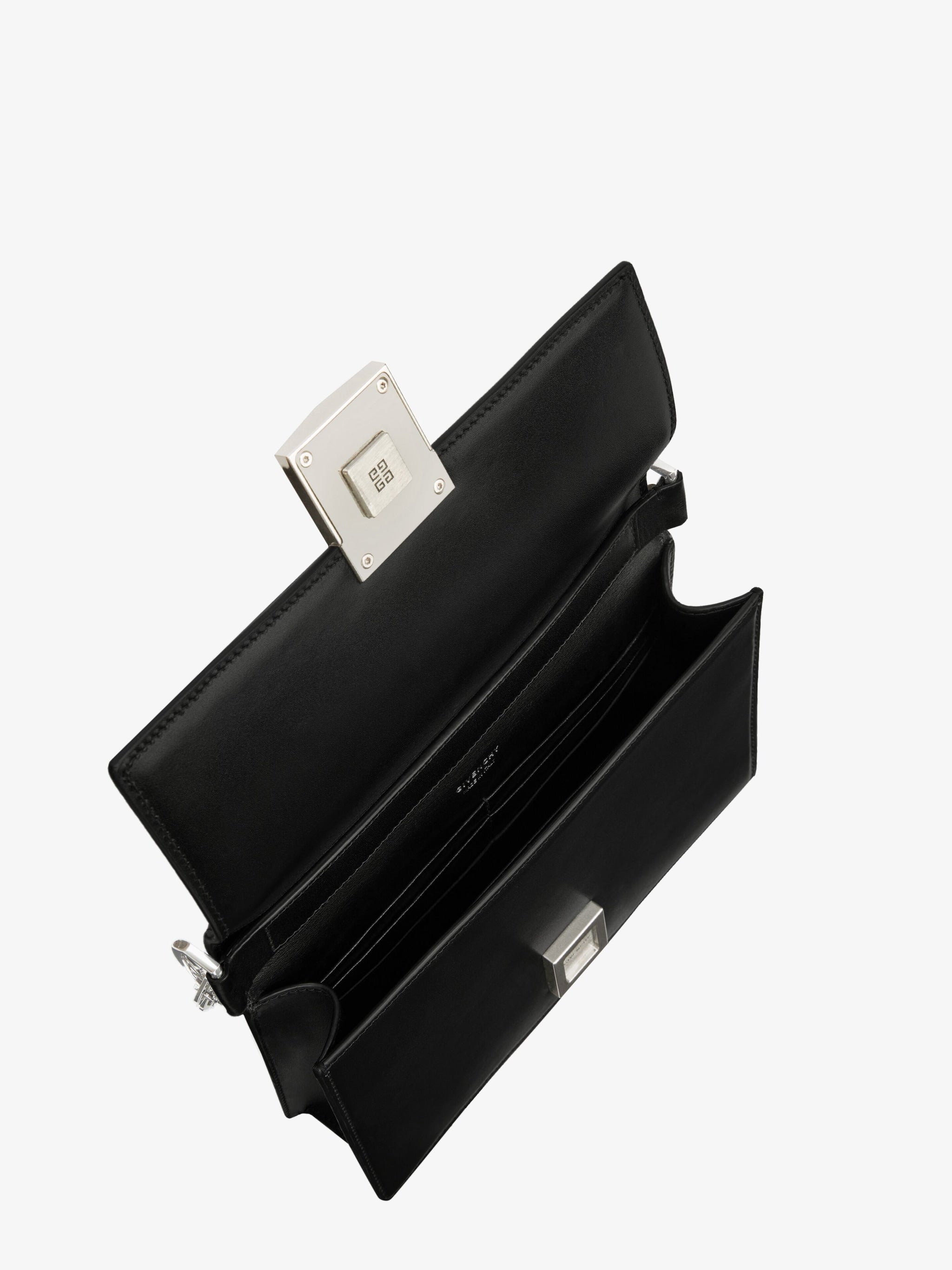 Composition: 100% calfskin leather. Lining: 51% polyurethane, 49% cotton. Metal pieces: 100% brass.