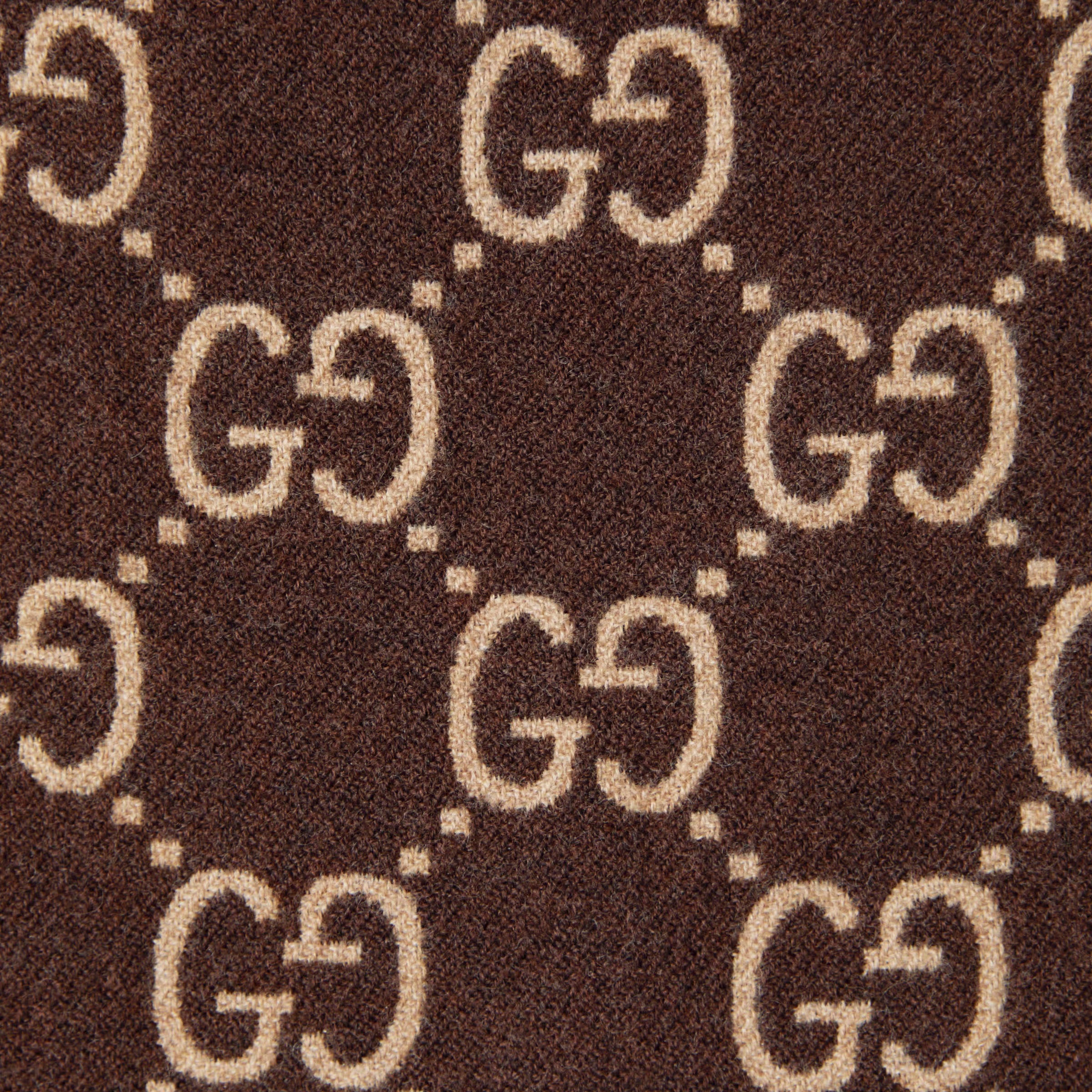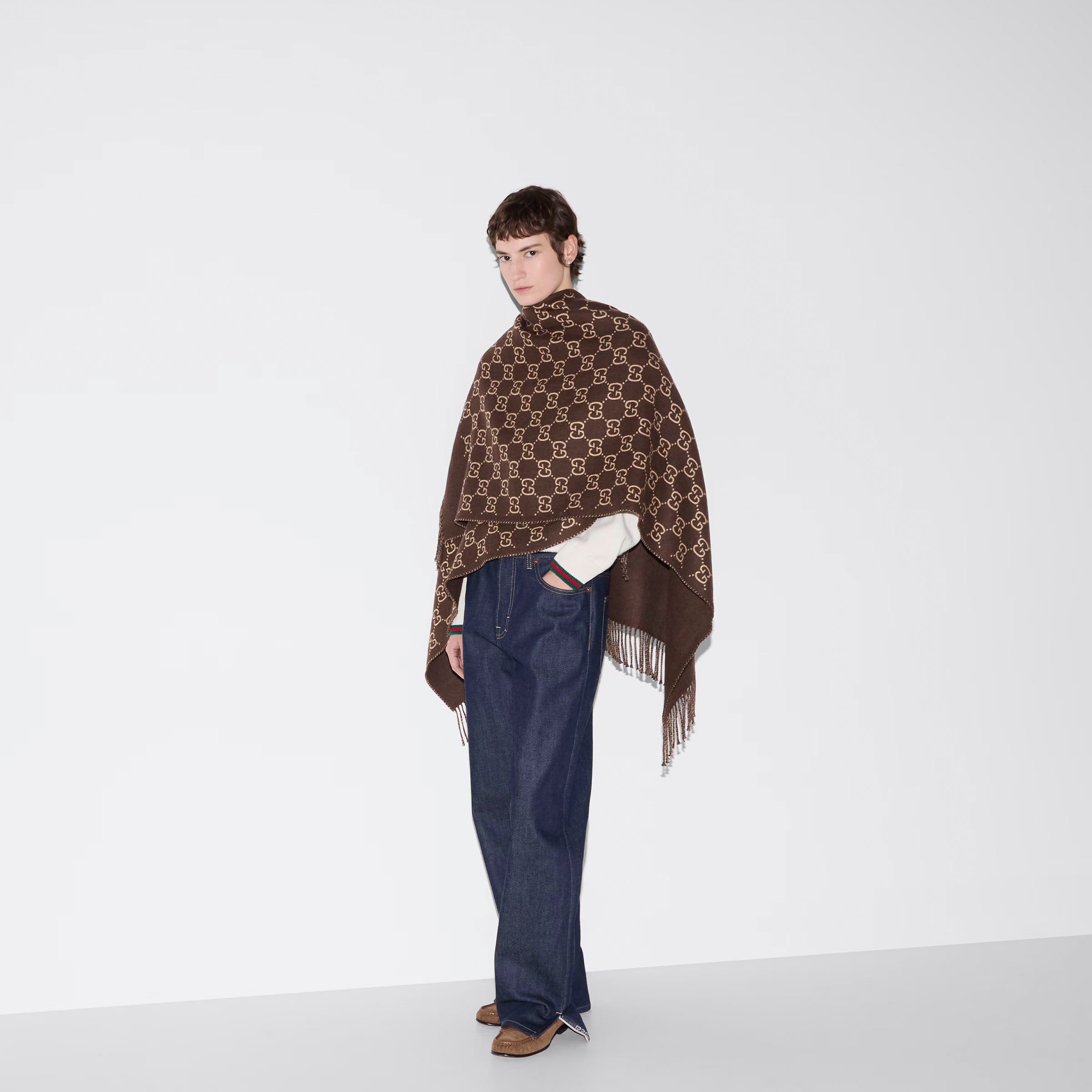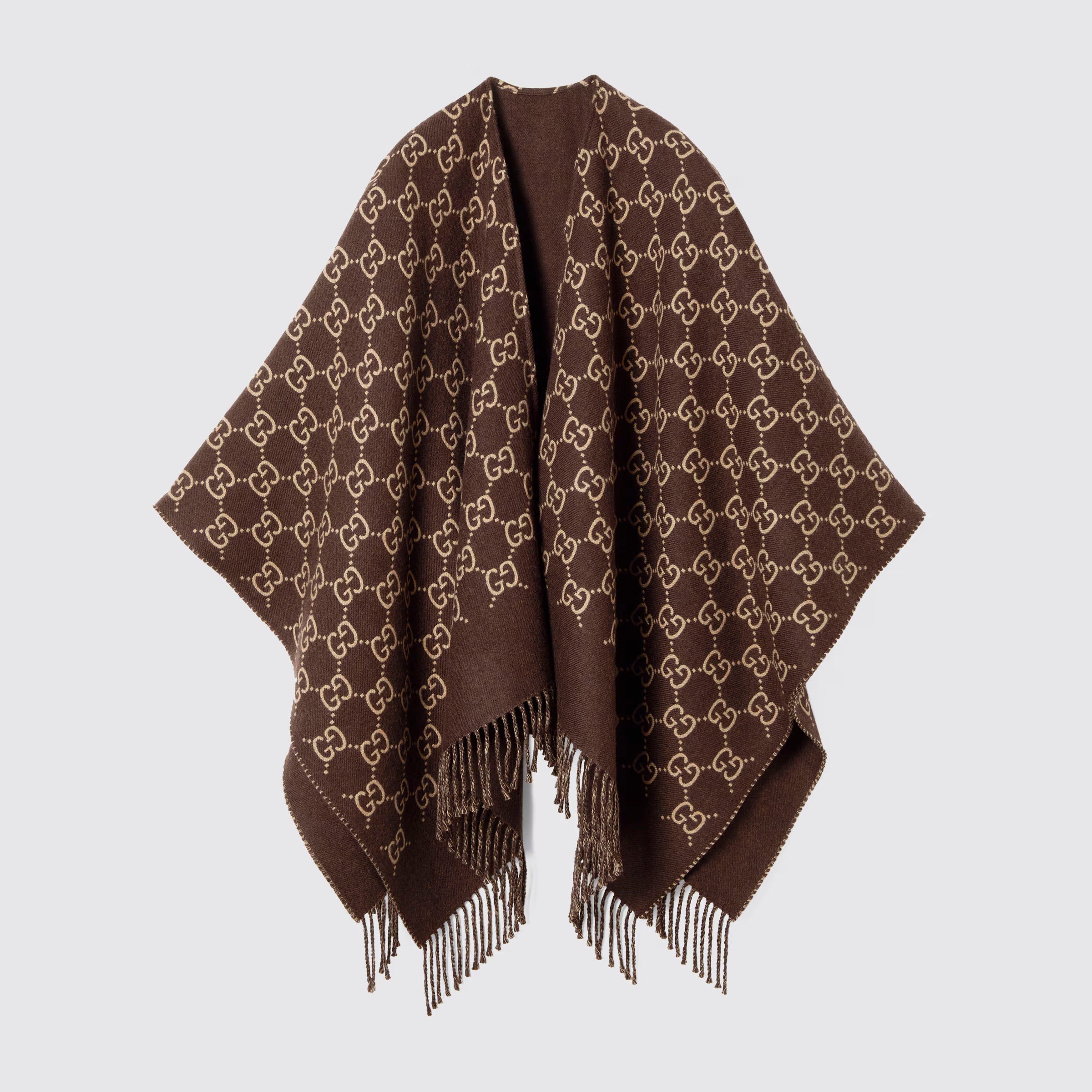 The initials of the Founder of the House, Guccio Gucci, alternate across a selection of soft accessories. This wool cape is decorated with a GG jacquard, while a fringed trim completes the piece.