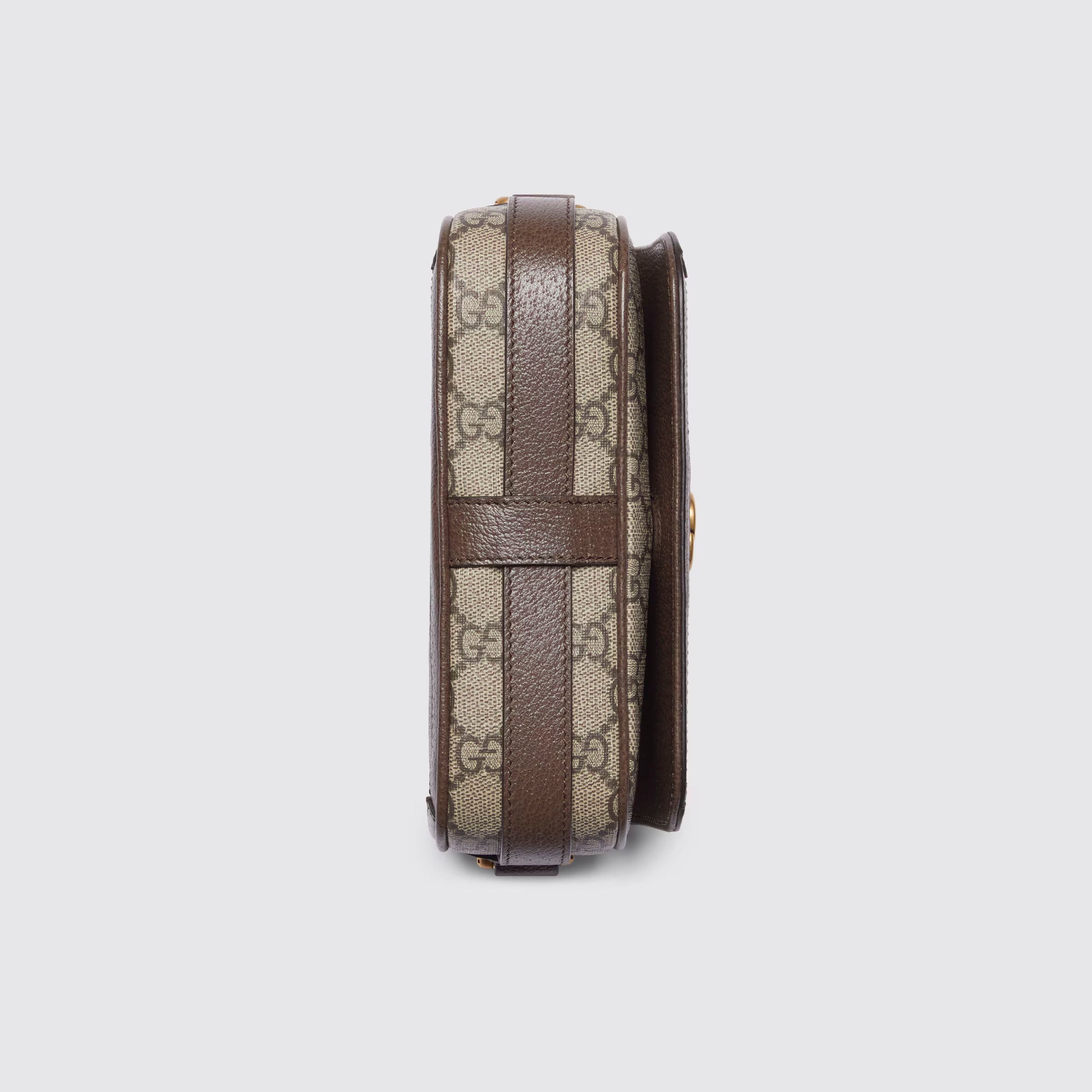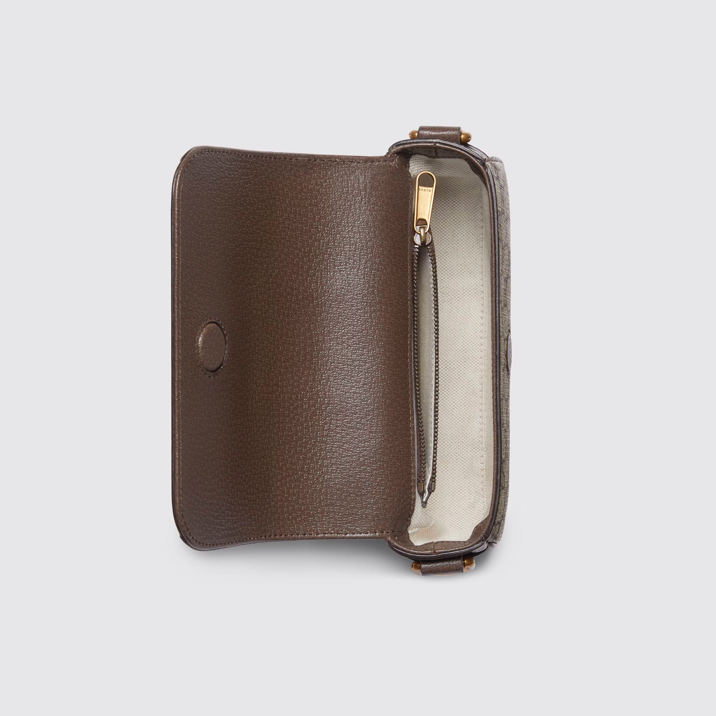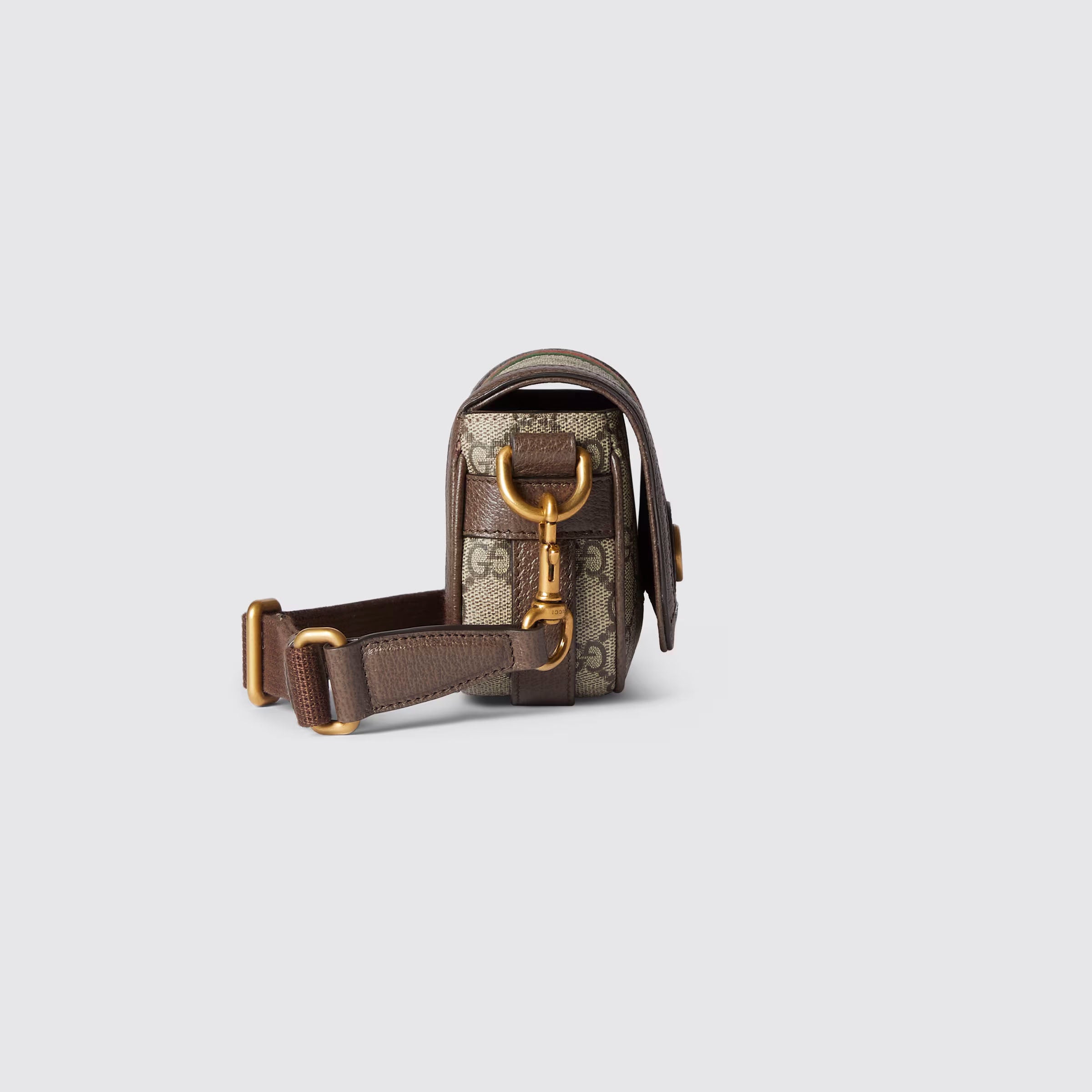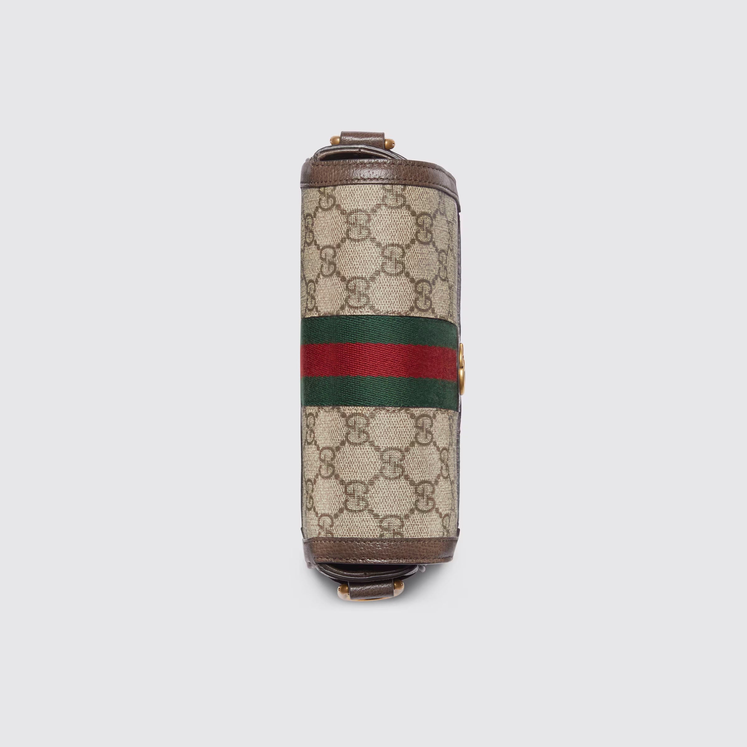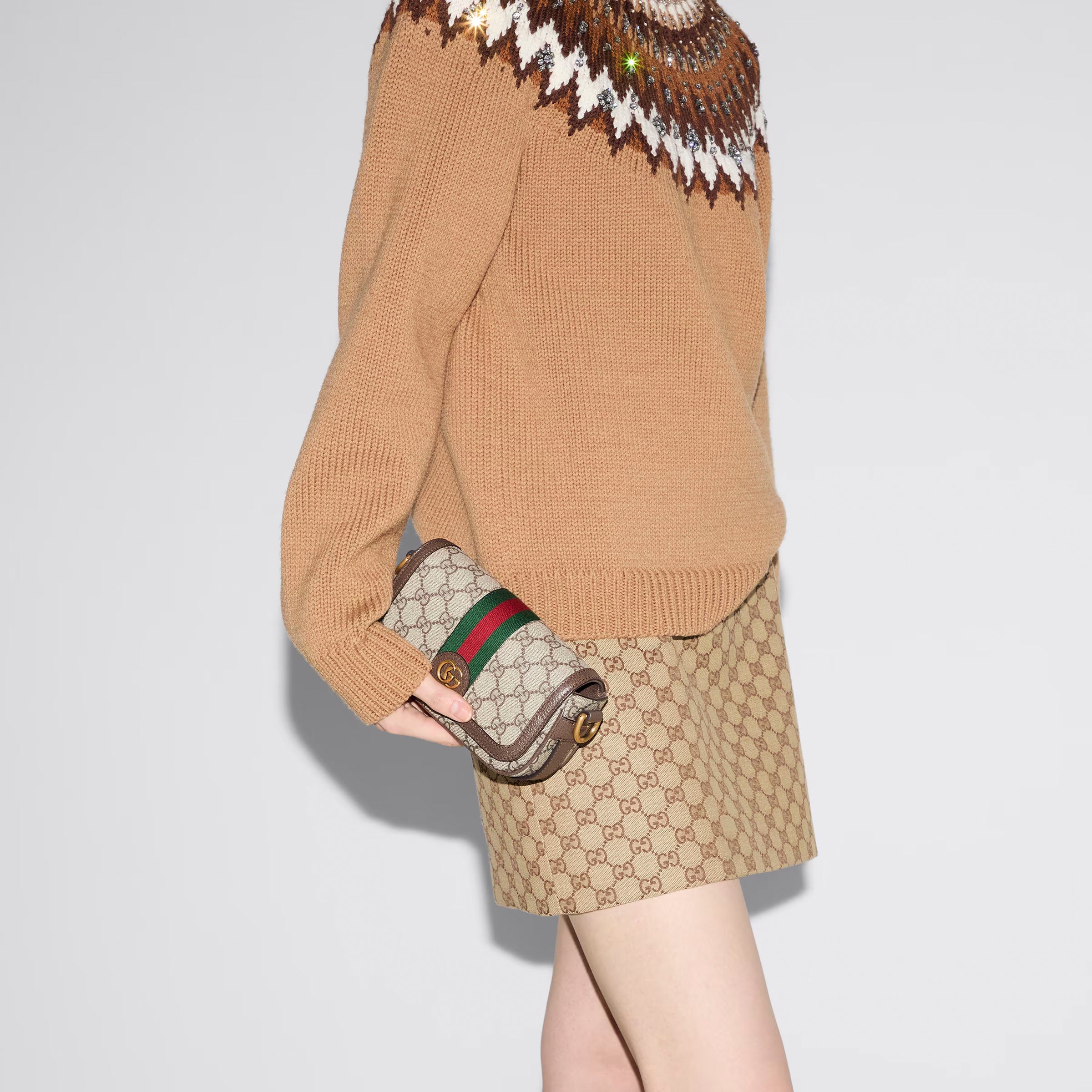 A selection of bags, including mini cross-body bags, briefcases and totes have been reshaped with functional details. Crafted from beige and ebony GG Supreme canvas, this Ophidia super mini bag features one inside zip pocket, while the outside shows off the Double and Web stripe.