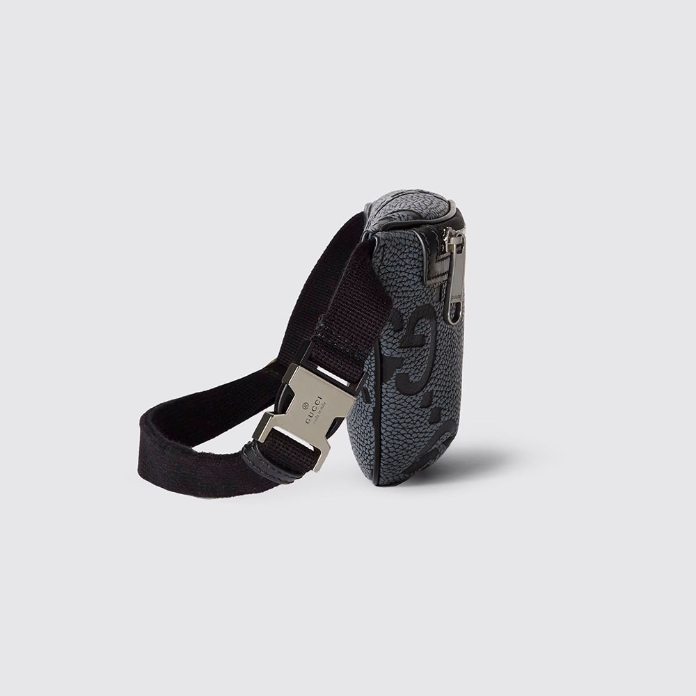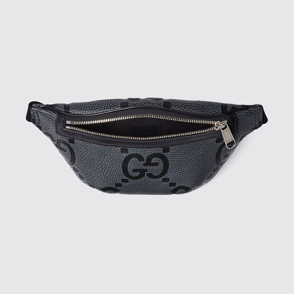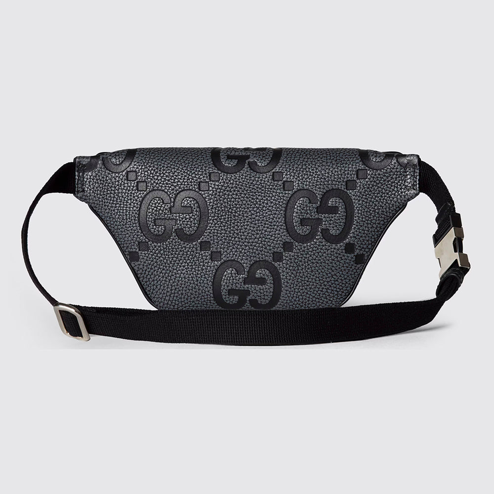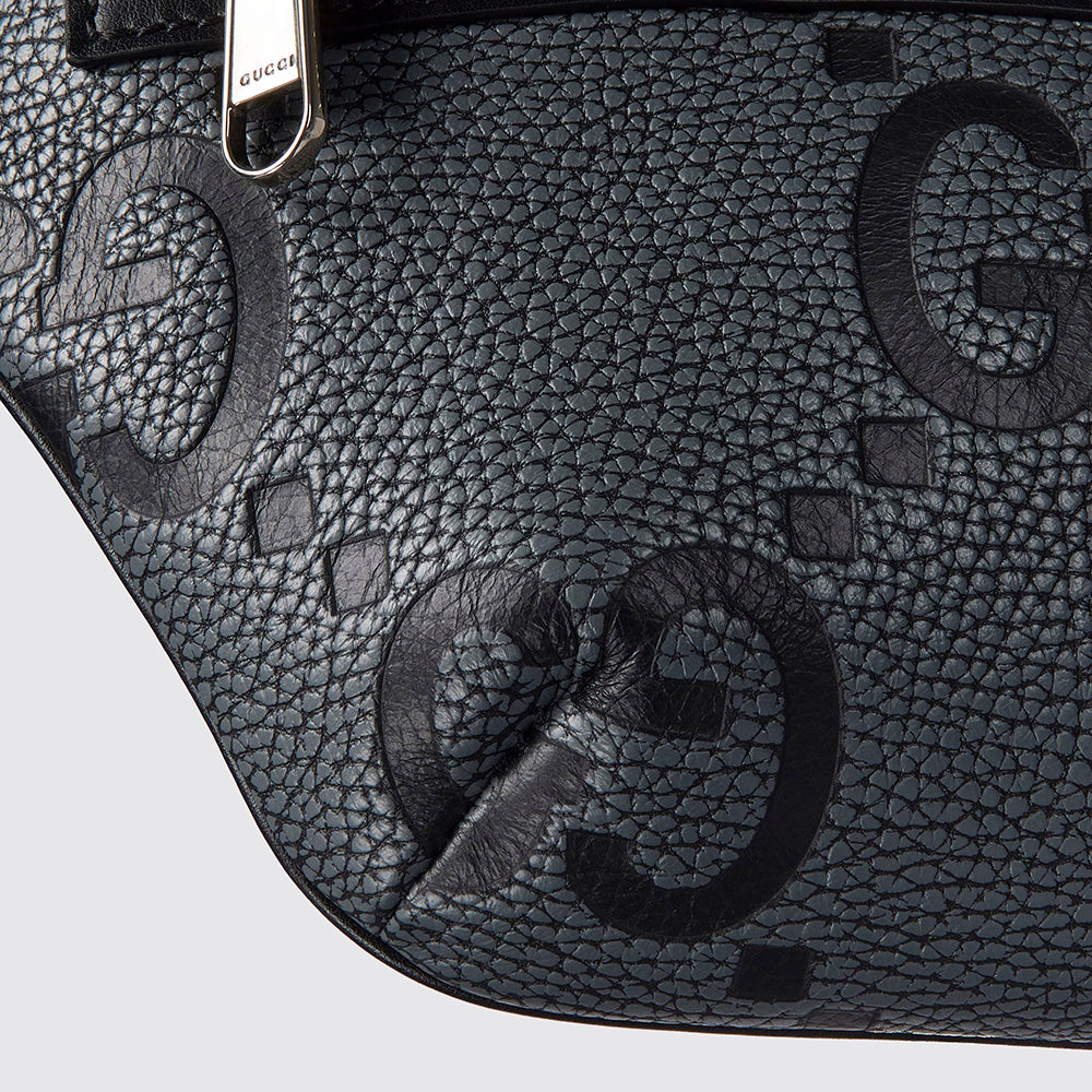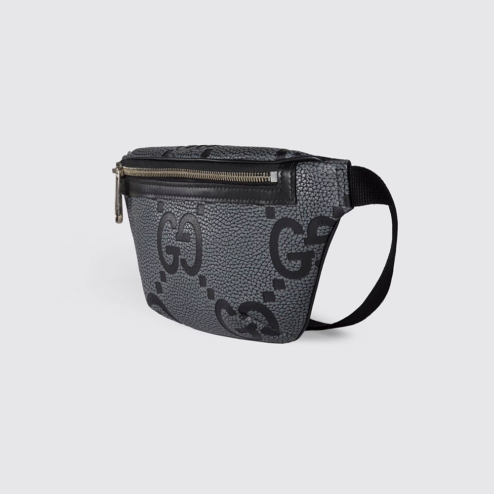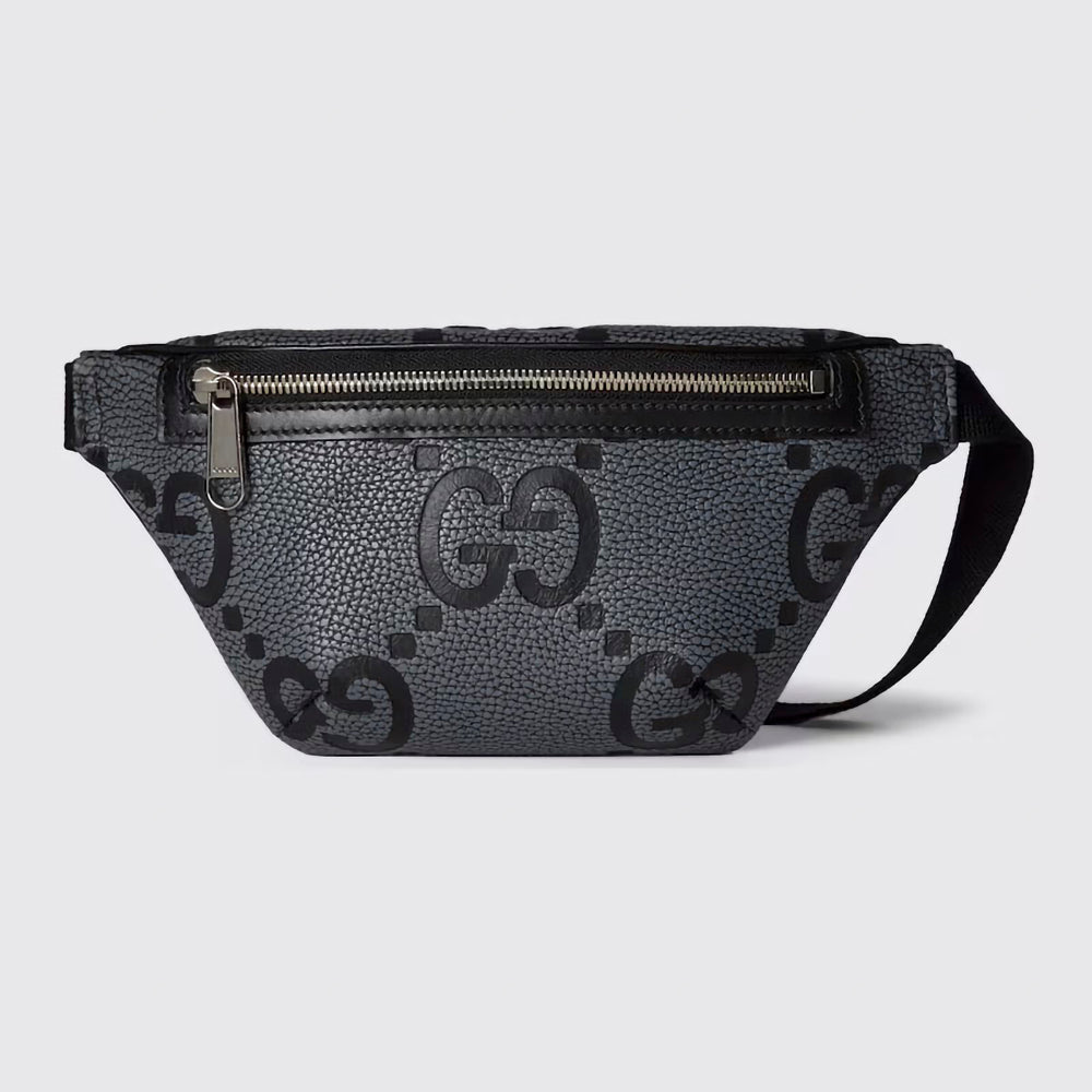 The jumbo GG design continues for Cruise 2025 with a new grainy texture. A reinterpretation of Guccio Gucci's initials, the motif is an evergreen of the House that appears prominently in maxi dimensions for an eye-catching logo feel. This grey and black belt bag in the emblematic leather can also be worn as a cross-body style.