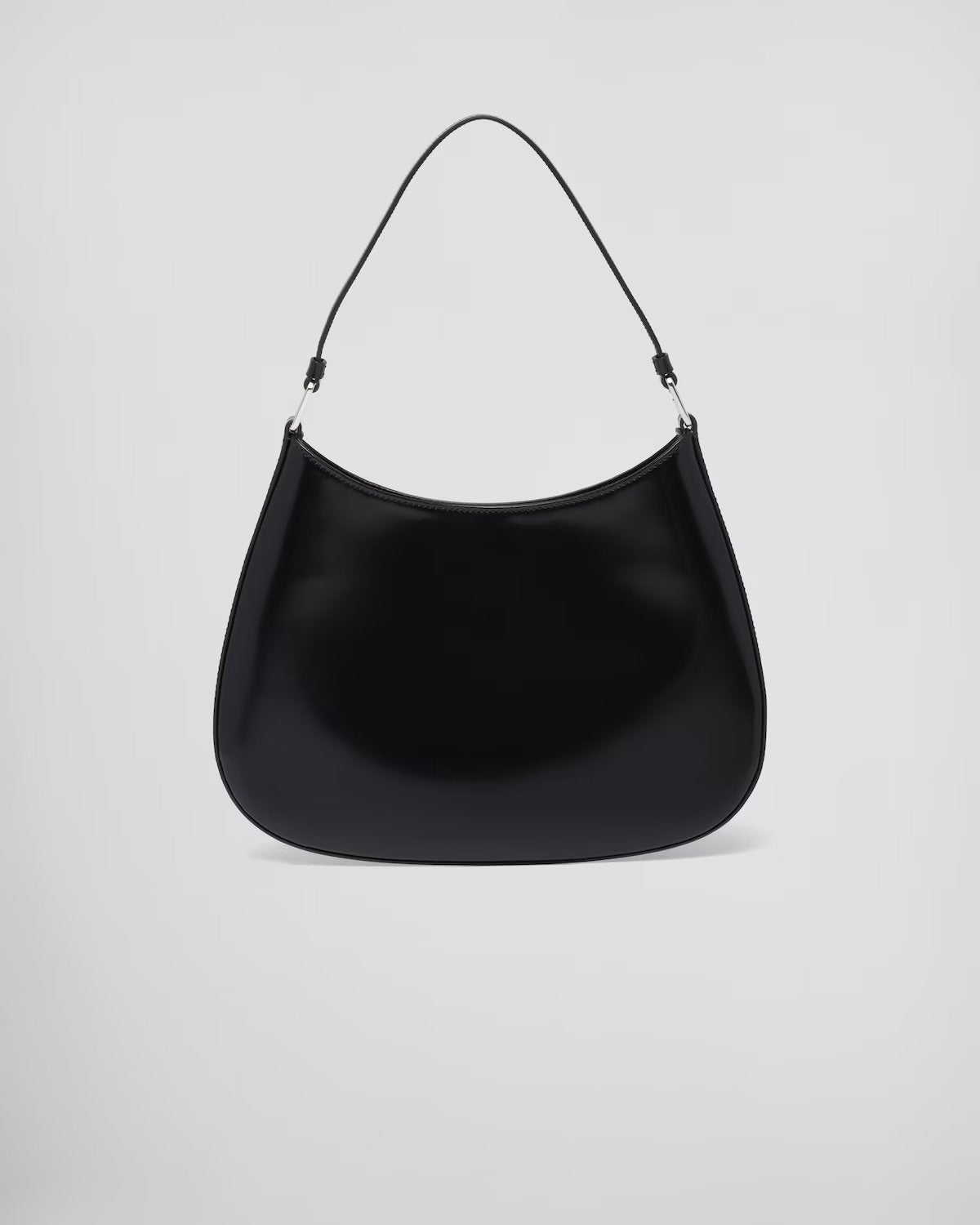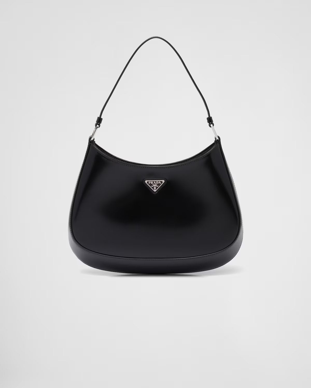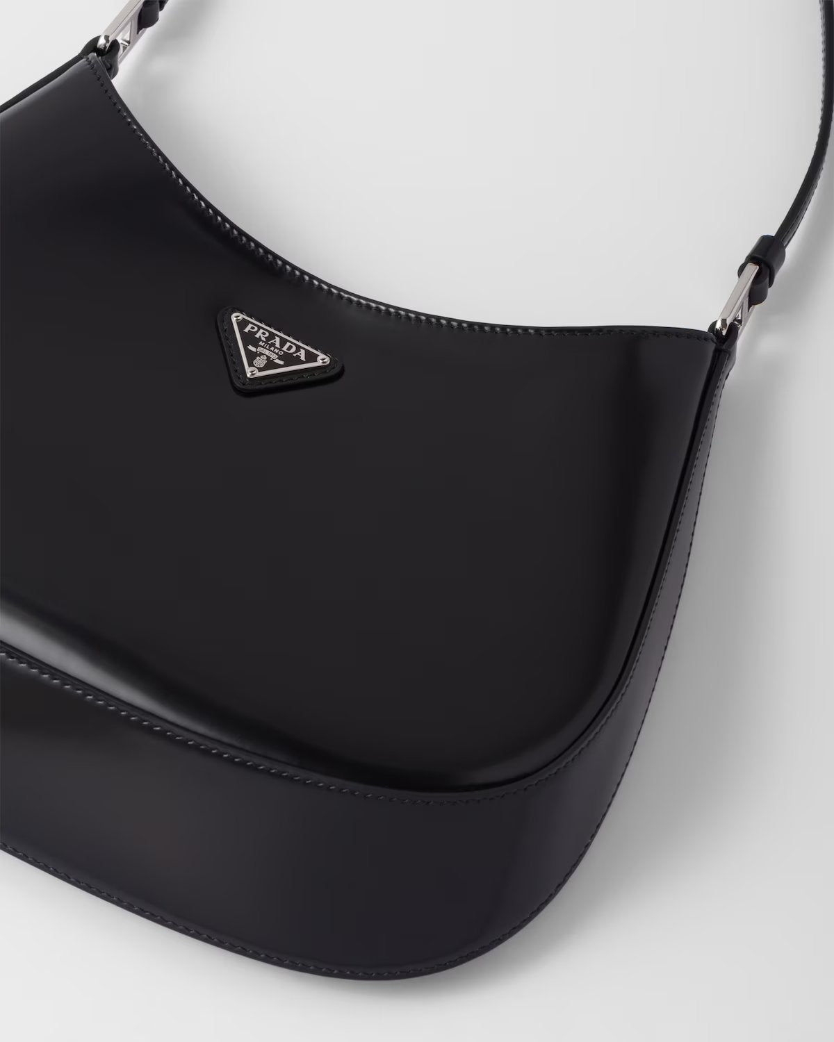 The Prada Cleo bag with sophisticated allure reinterprets an iconic design of the brand from the 1990's. Sleek curved lines emphasized by the particular construction rounded on the bottom and sides give this hobo bag a soft, light look. Brushed leather, a modern and versatile material that is distinctive in Prada collections, is ideal for creating always new combinations and contrasts. The enamel triangle logo decorates the silhouette.