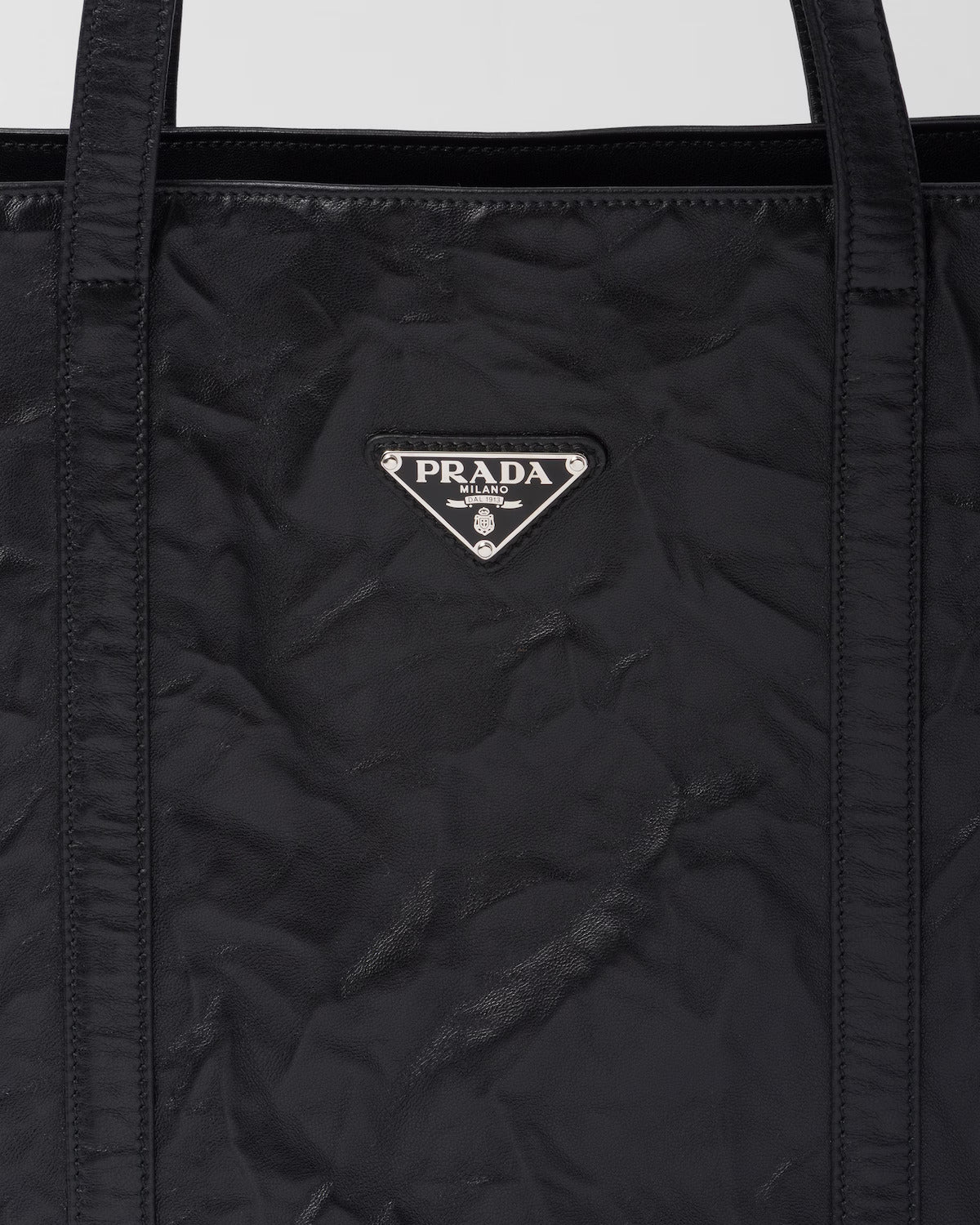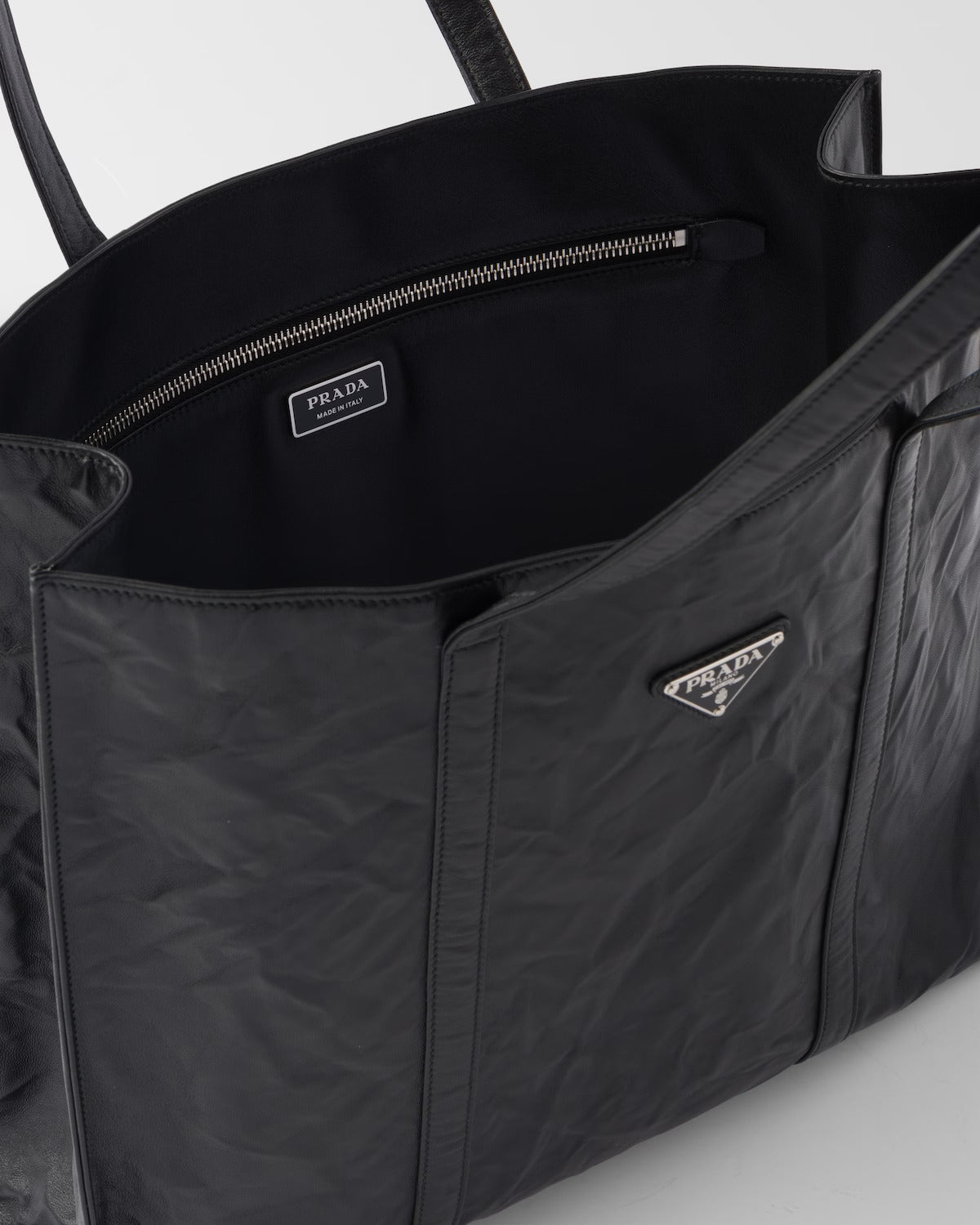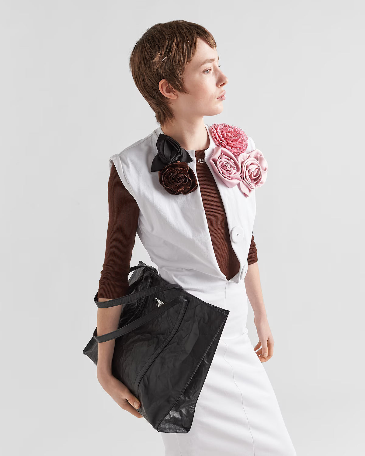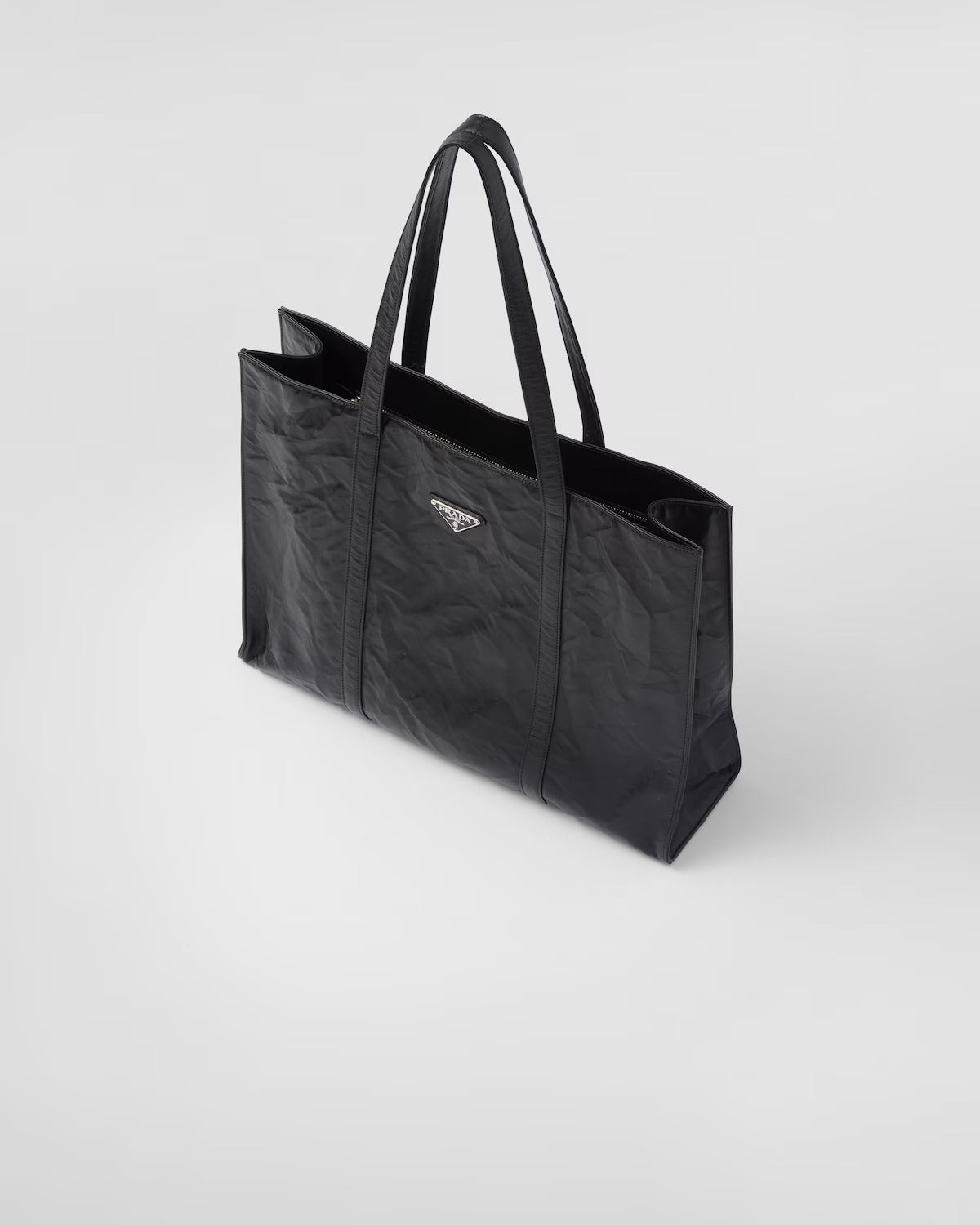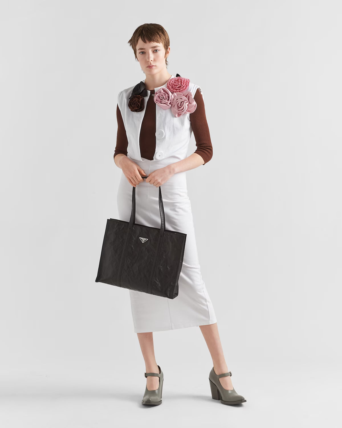 This bag with casual, everyday allure is made of glossy nappa leather with a natural finish. The handmade wrinkled effect contrasts with the concept of a rigid construction, reinterpreting an everyday object that can be worn without constraints. Presented for the Spring Summer 2023 collection, the accessory is decorated with the enameled metal triangle logo.
