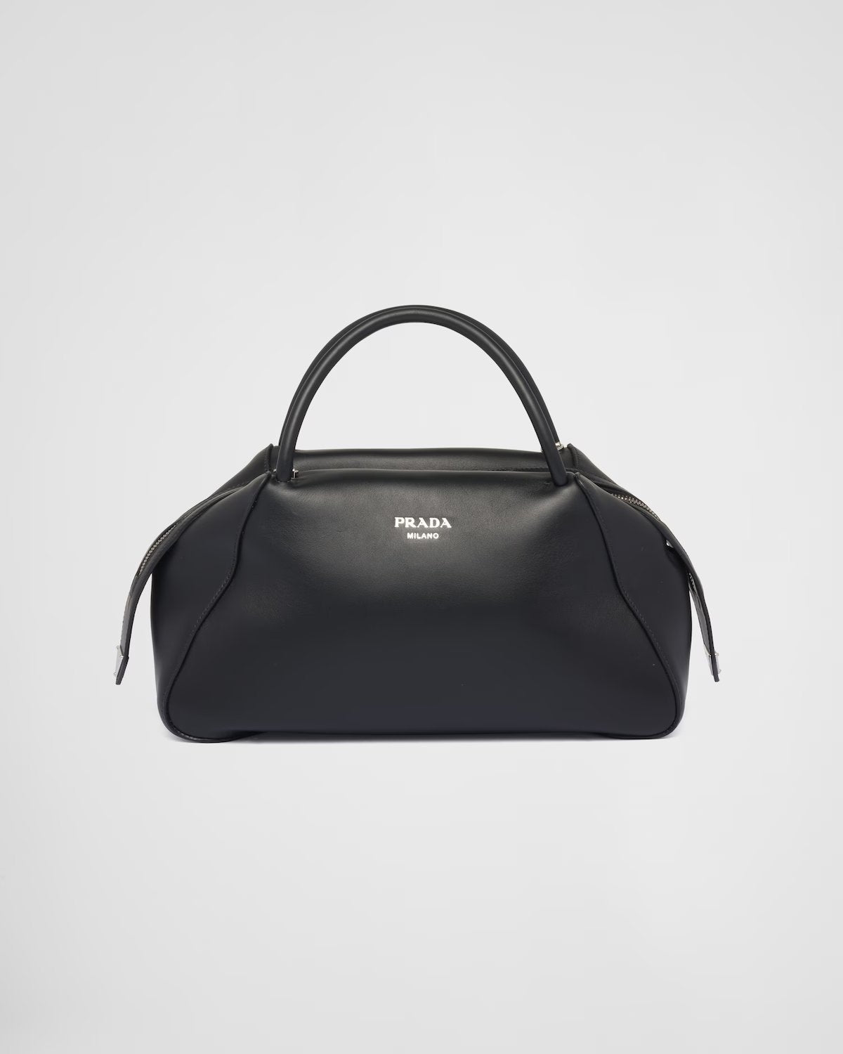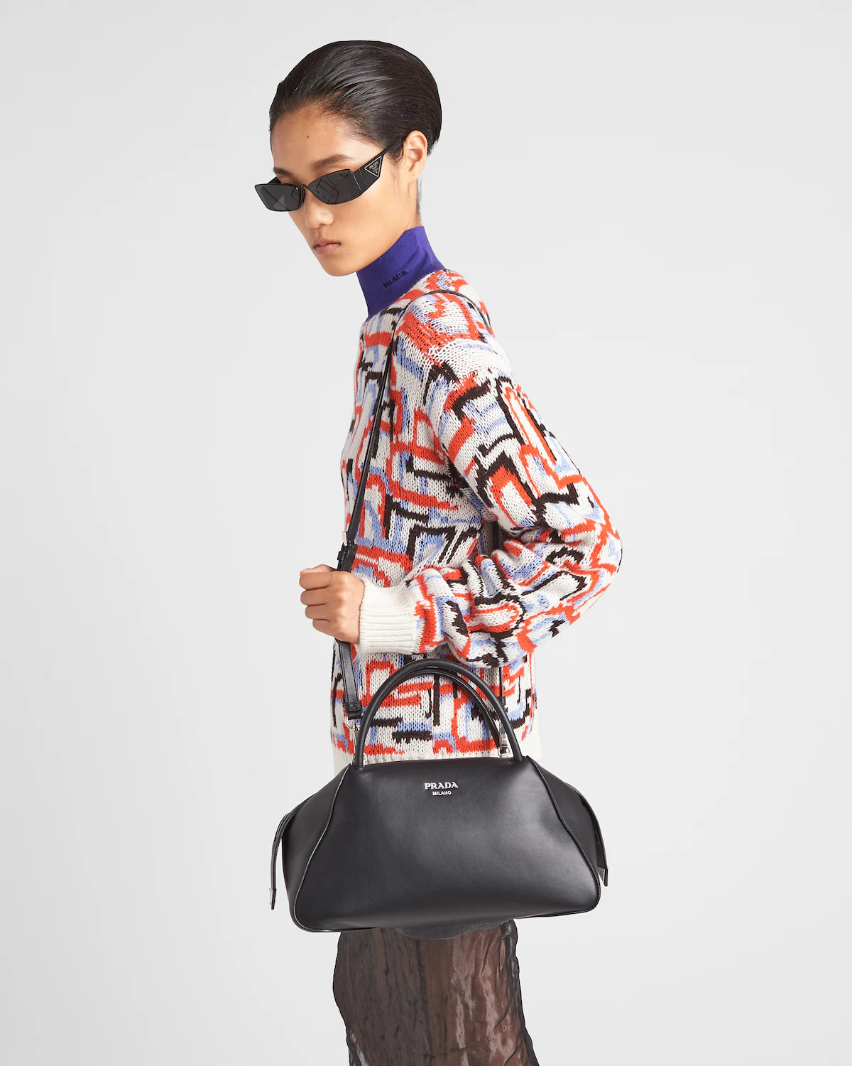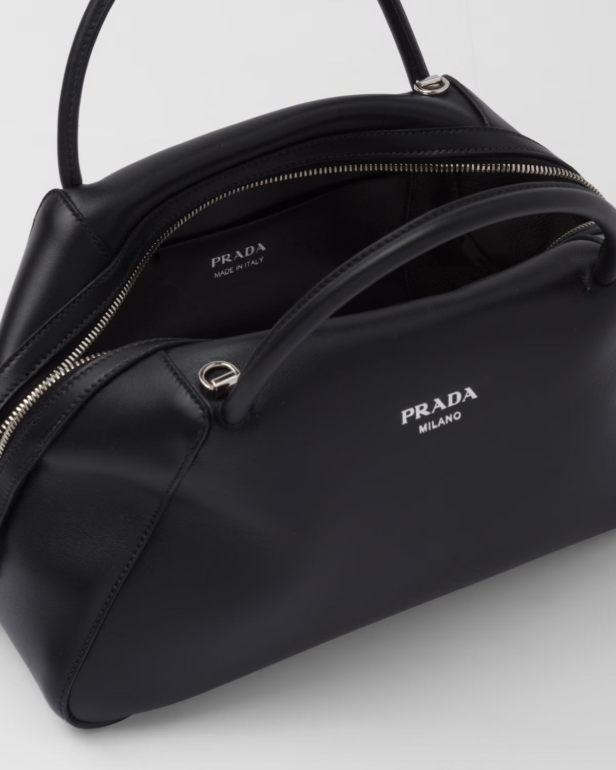 A study of the lines characterizes this medium leather handbag. It stands out for its absolutely elegant silhouette emphasized by the zipper closure with a sinuous effect. The enameled metal triangle logo decorates the accessory.