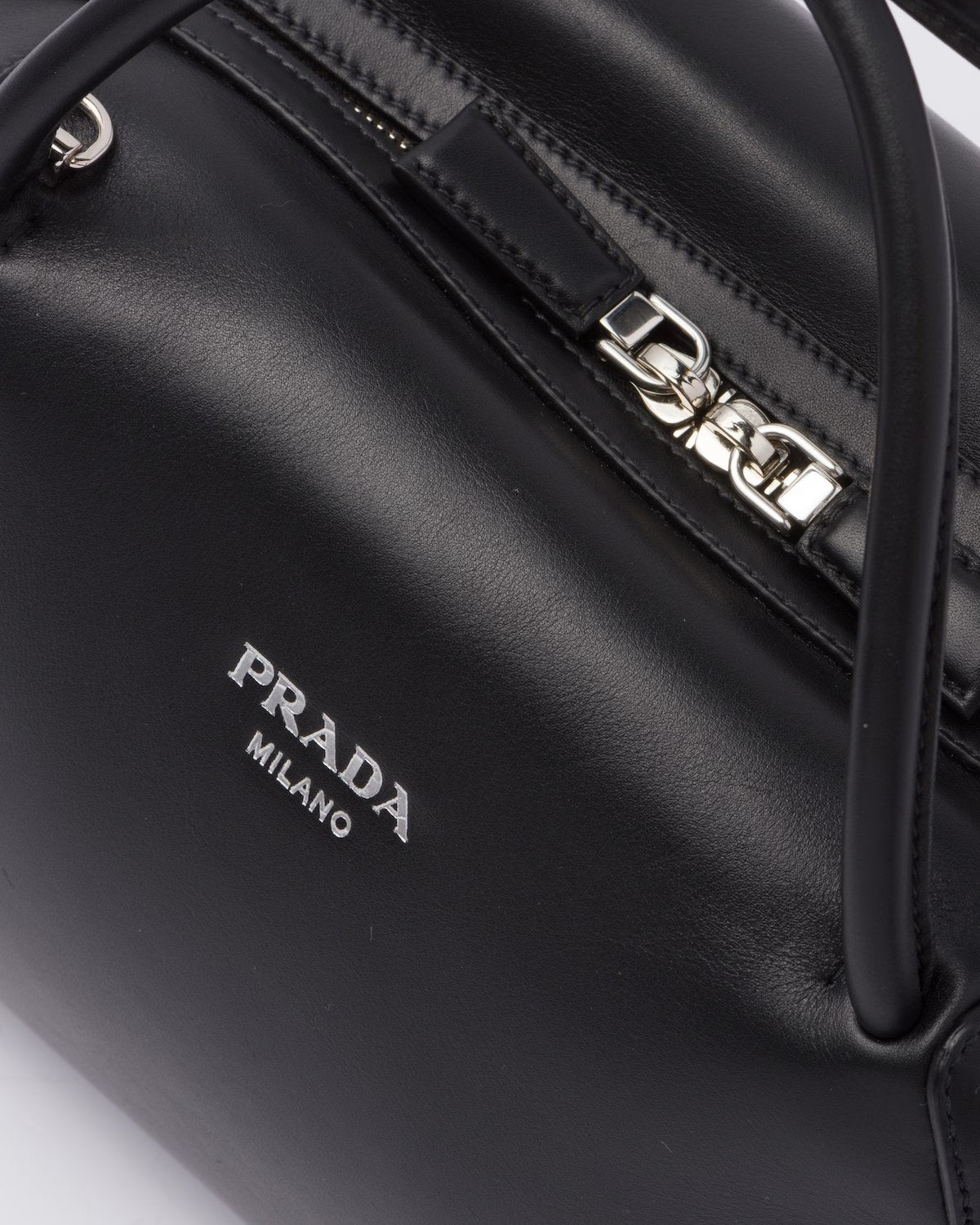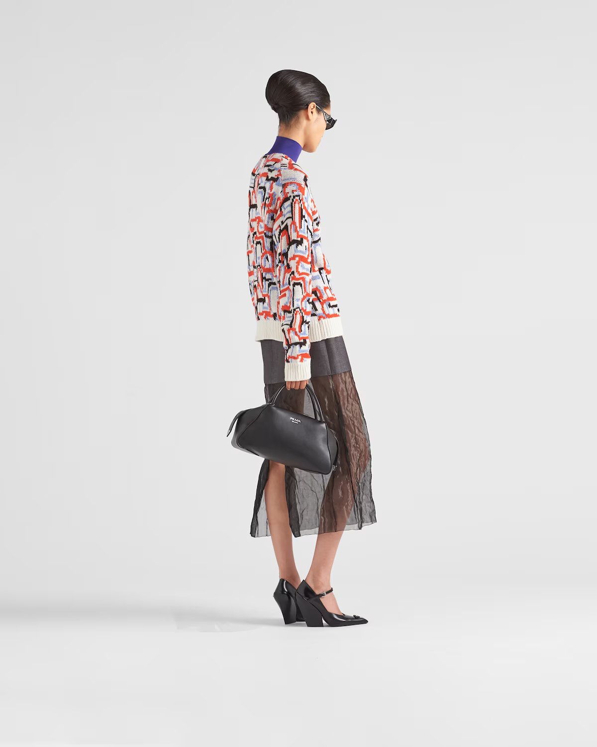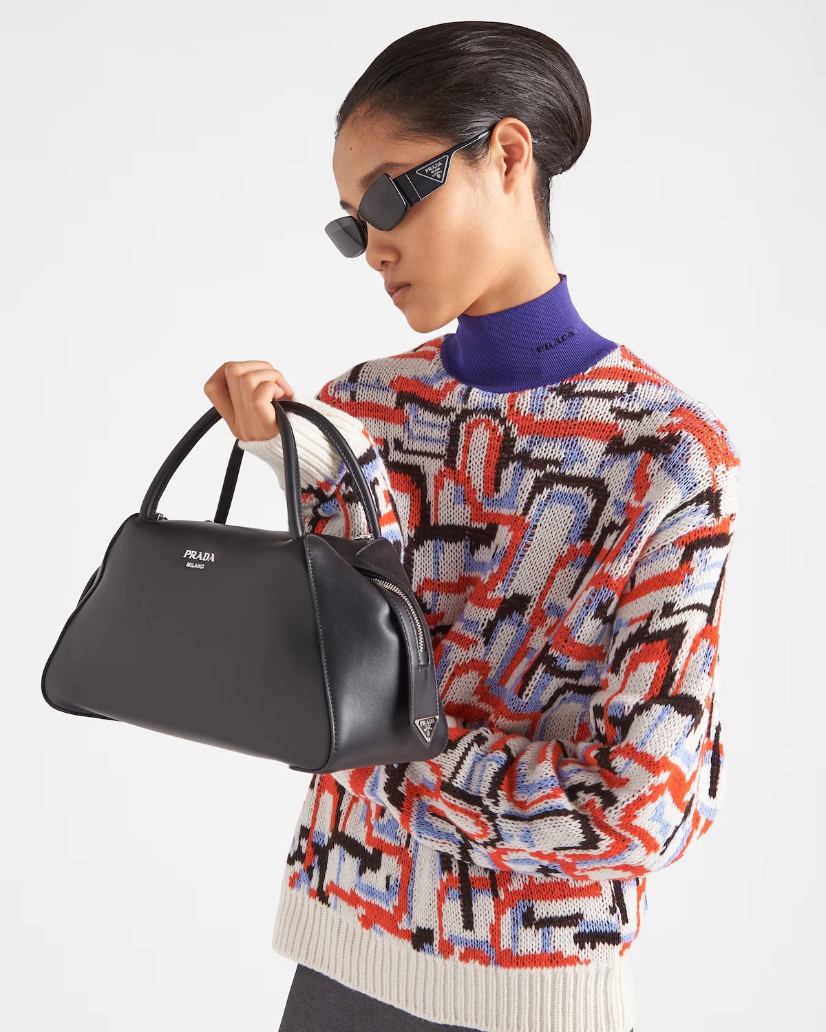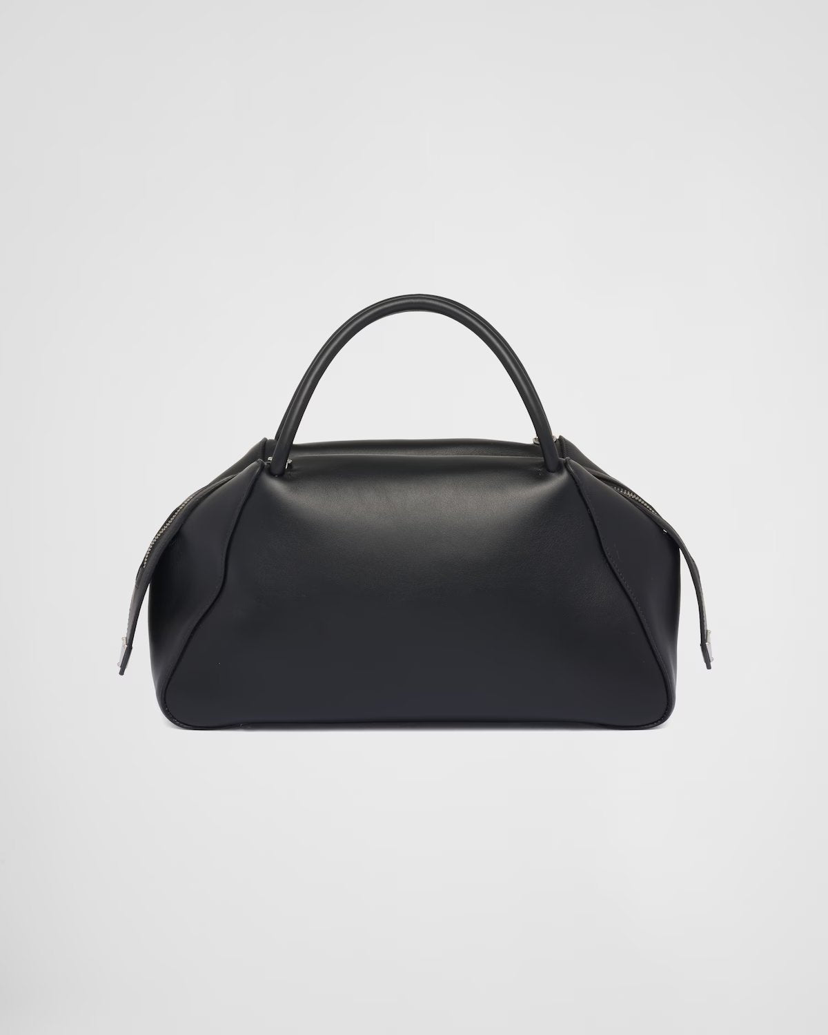 A study of the lines characterizes this medium leather handbag. It stands out for its absolutely elegant silhouette emphasized by the zipper closure with a sinuous effect. The enameled metal triangle logo decorates the accessory.