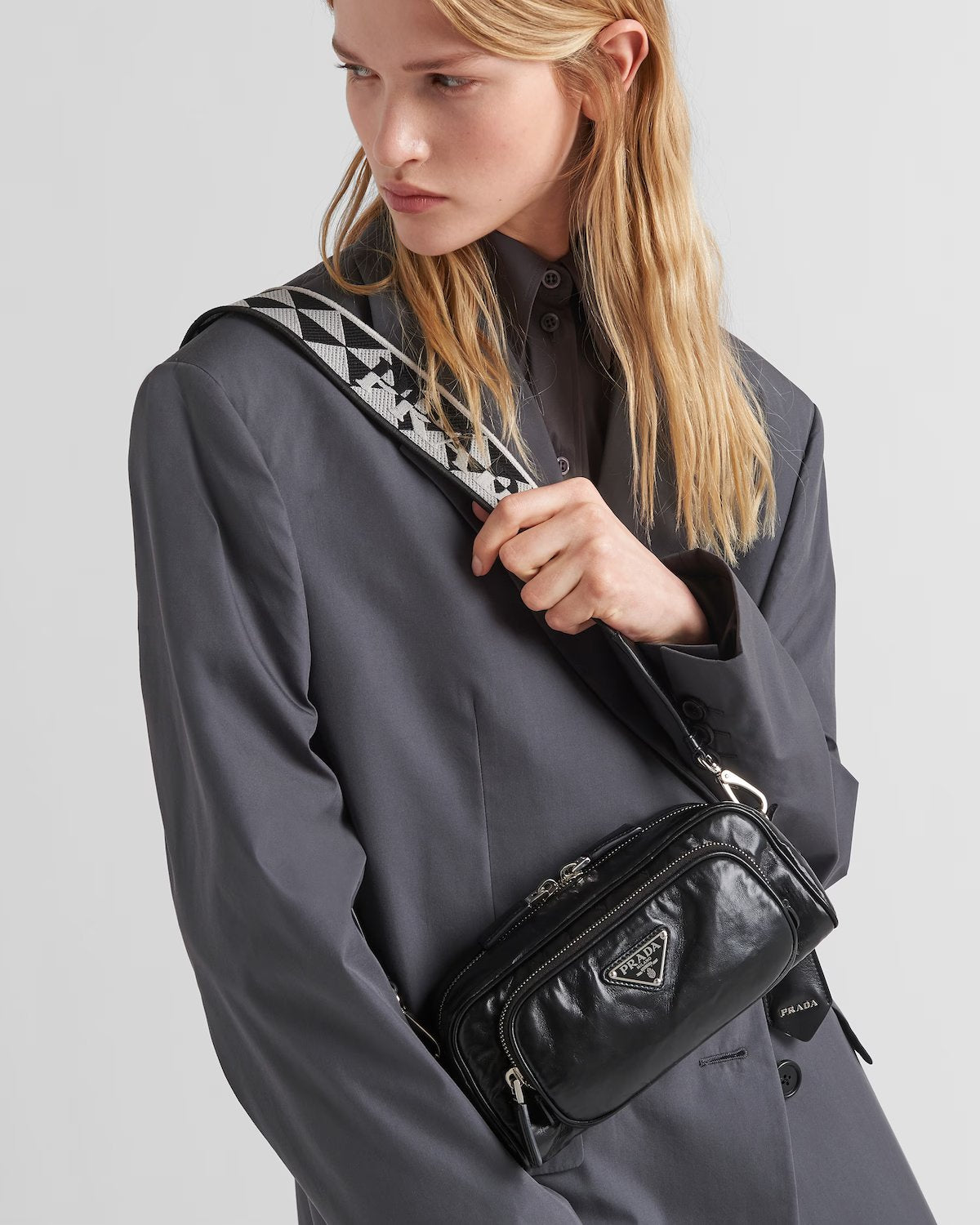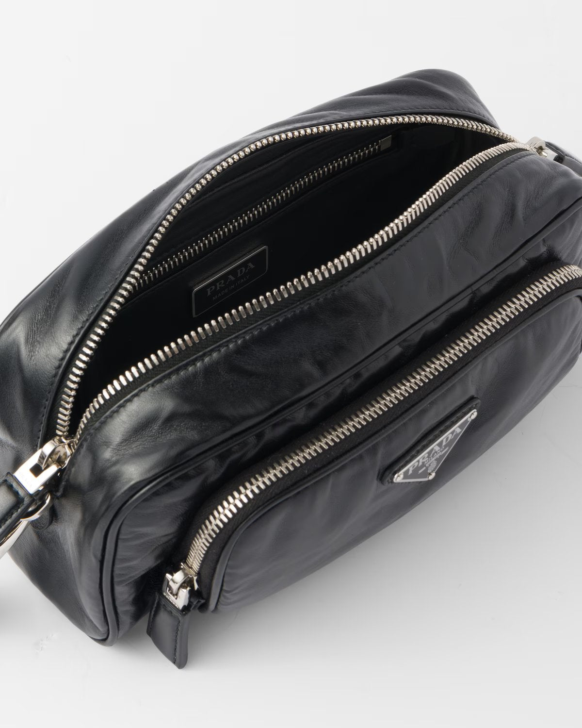 This bag with compact allure is made of nappa leather with a natural, glossy finish. The hand-made wrinkled effect contrasts with the constructed and rigid concept, reinterpreting an everyday object to be worn without constraints. Presented in the Spring Summer 2023 show, the style is accented with a finely embroidered shoulder strap with a sporty mood.