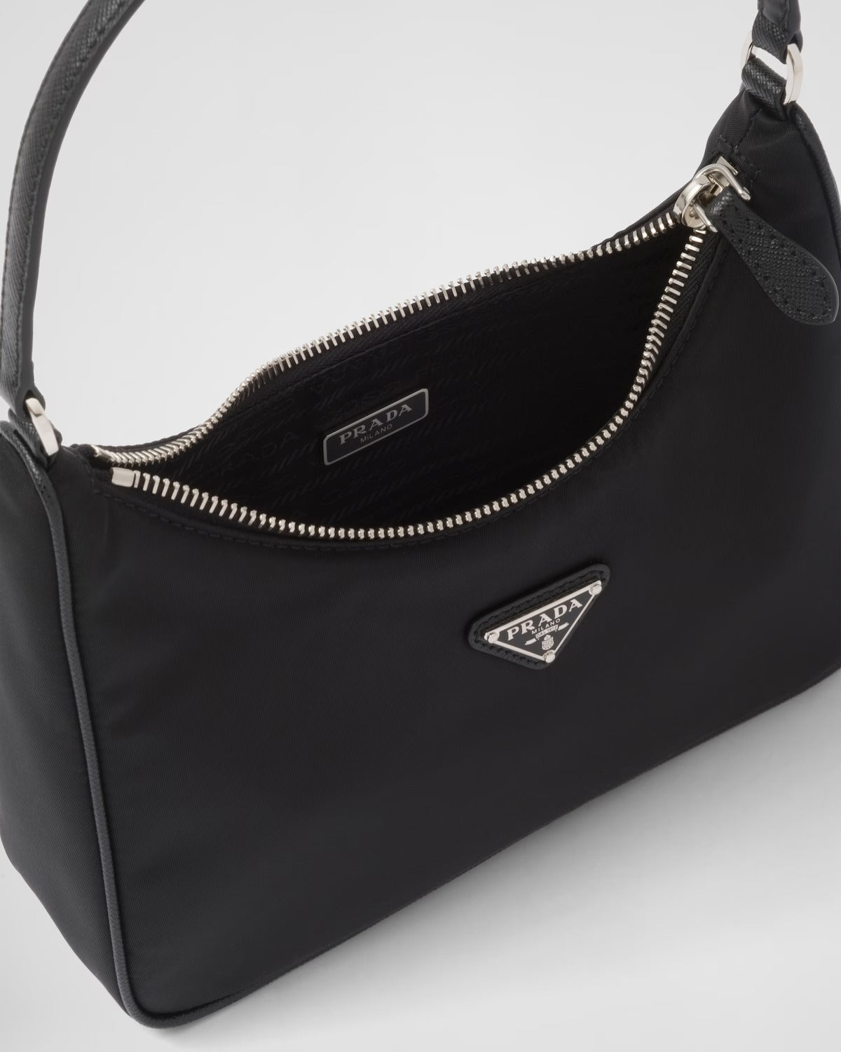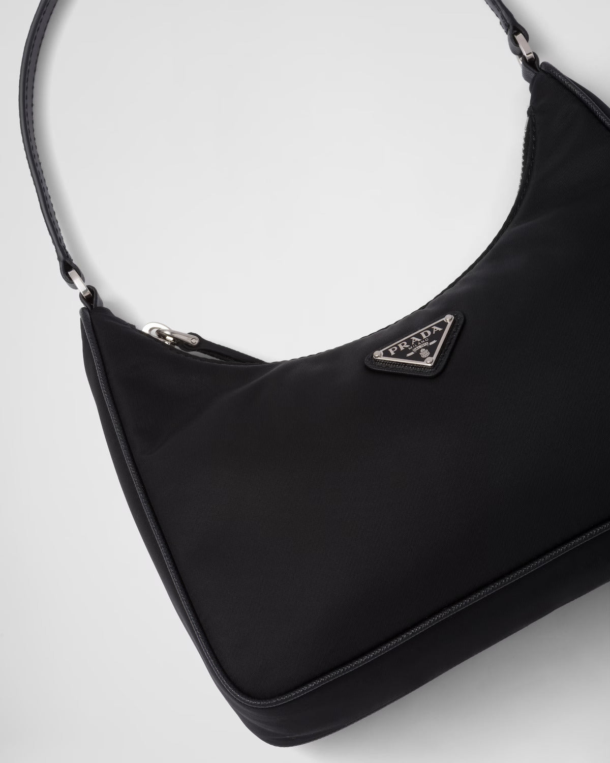 Inspired by the iconic mini hobo bag, the Prada Re-Edition 2005 shoulder bag is made of Re-Nylon: a regenerated nylon yarn produced from recycled, purified plastic trash collected in the ocean, fishing nets and textile waste fibers. Practical and feminine, the mini bag is decorated with iconic Saffiano leather trim. It features a contemporary mix of materials.