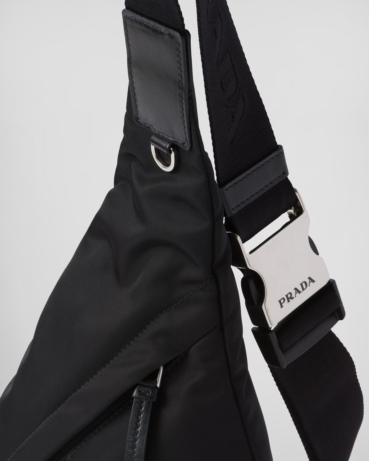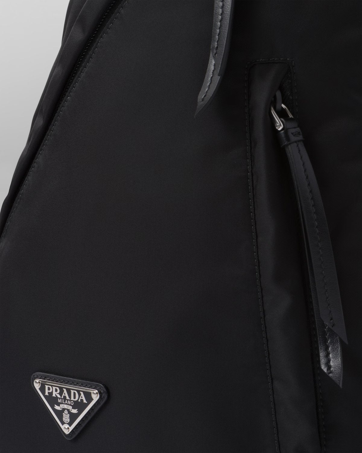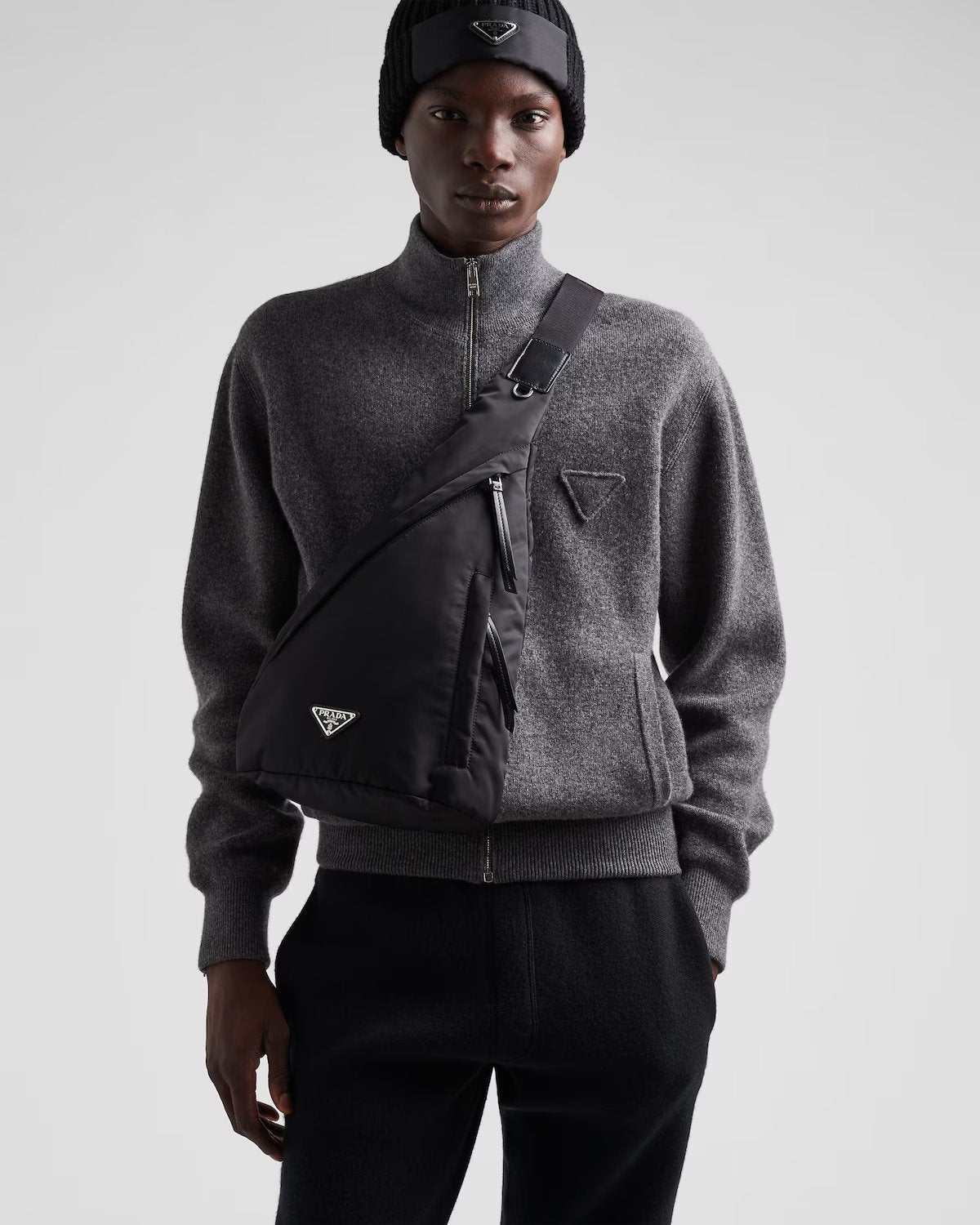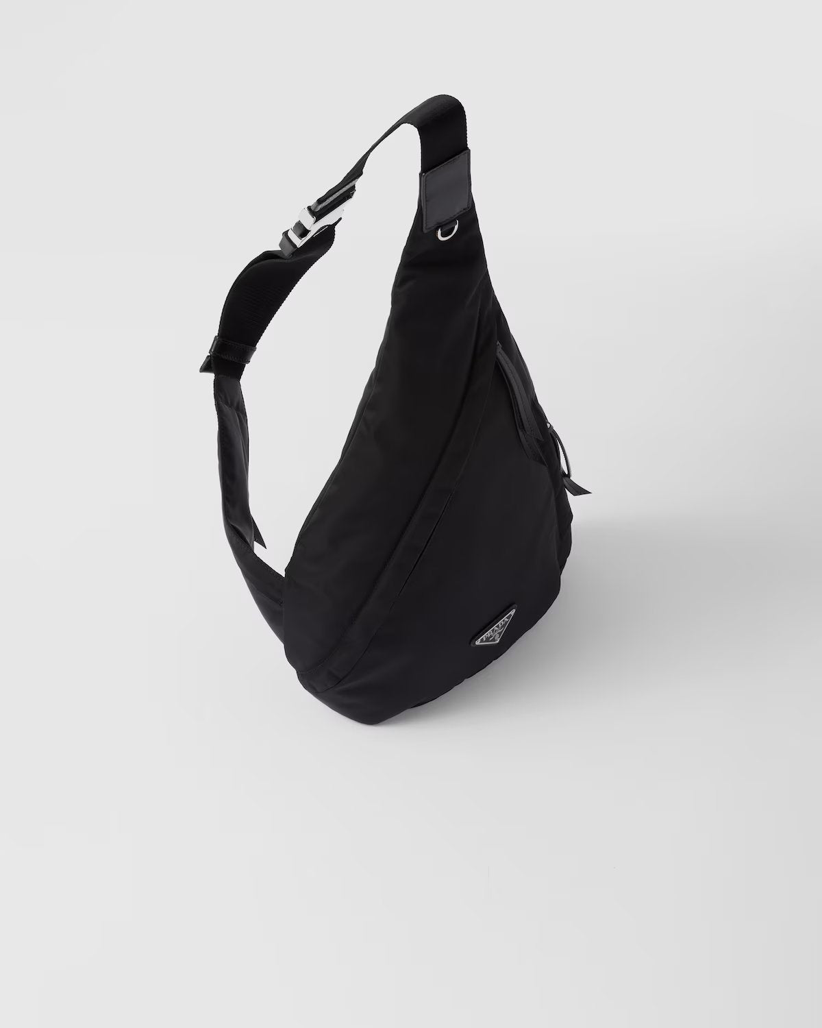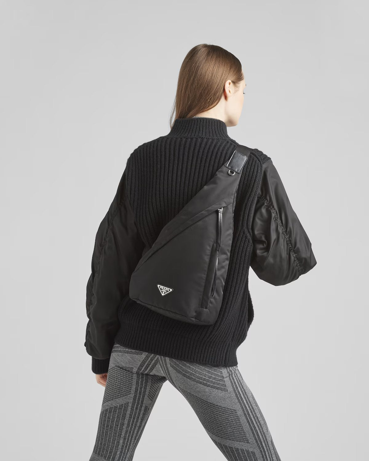 Sleek, minimalist lines are the choice for the new men's bags for Fall Winter 2021. Defined by its hybrid design, halfway between a backpack and shoulder bag, this accessory has one adjustable woven nylon shoulder strap with side-release buckle and is decorated with the iconic enameled metal triangle logo. The silhouette is made of innovative Re-Nylon, a regenerated yarn produced from recycled plastic trash collected in the ocean.