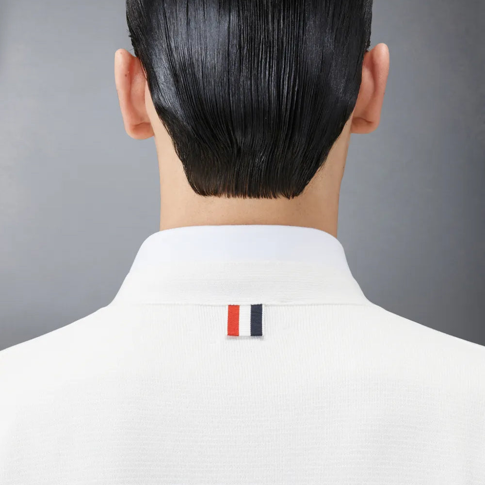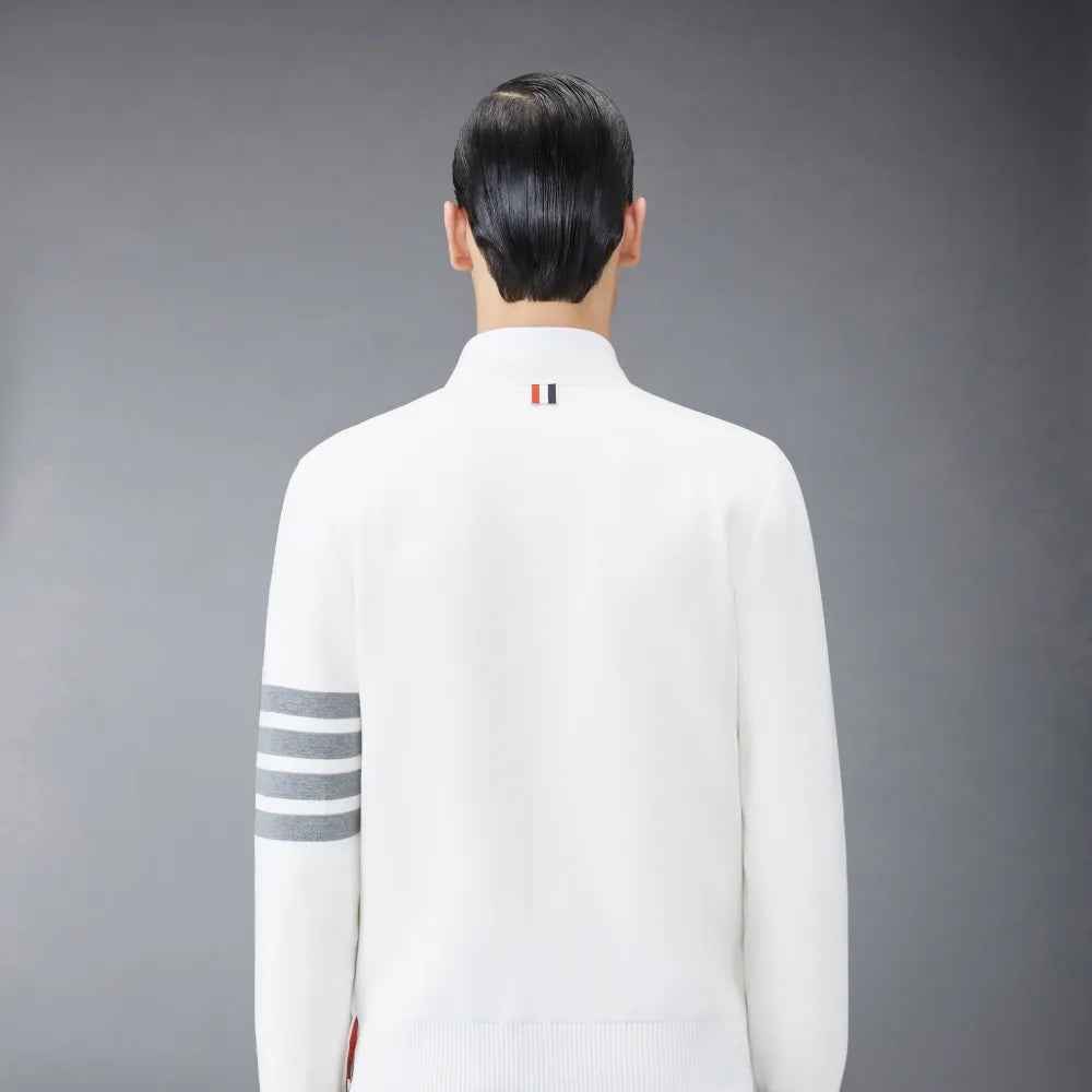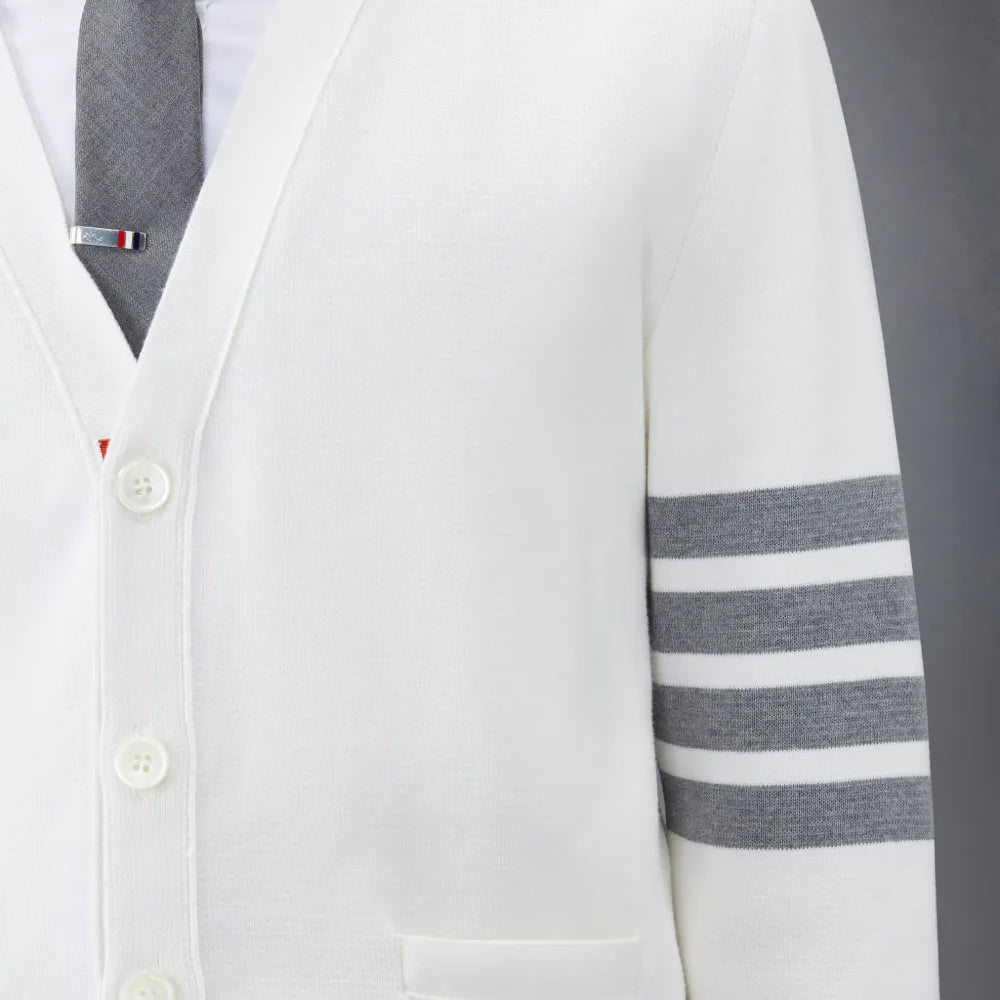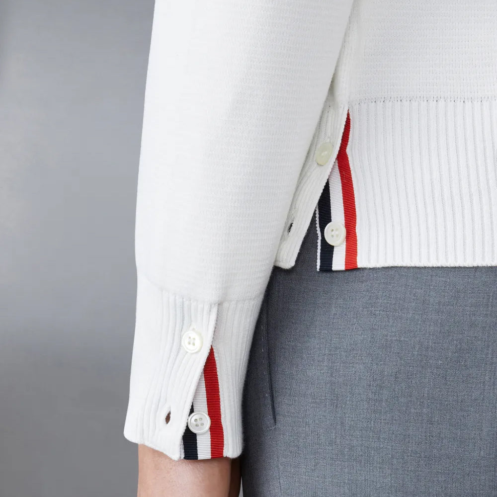 Two Thom Browne emblems define our Cotton Crepe V-neck Cardigan—grosgrain trim and 4-Bar stripe detailing, both synonymous with the brand.