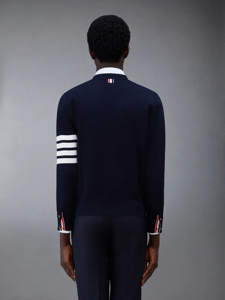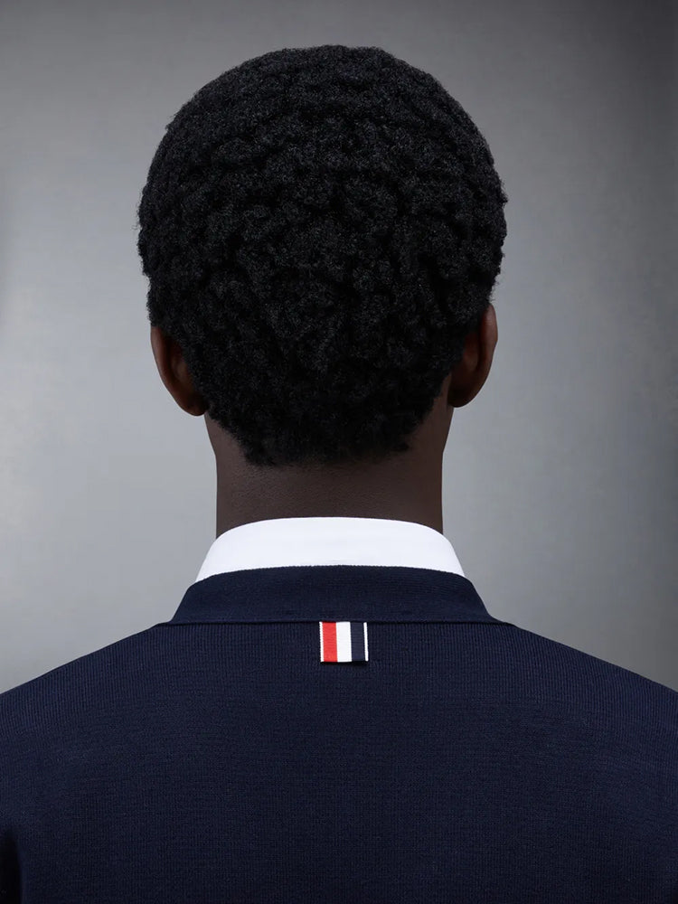 Two Thom Browne emblems define our Cotton Crepe V-neck Cardigan—grosgrain trim and 4-Bar stripe detailing, both synonymous with the brand.