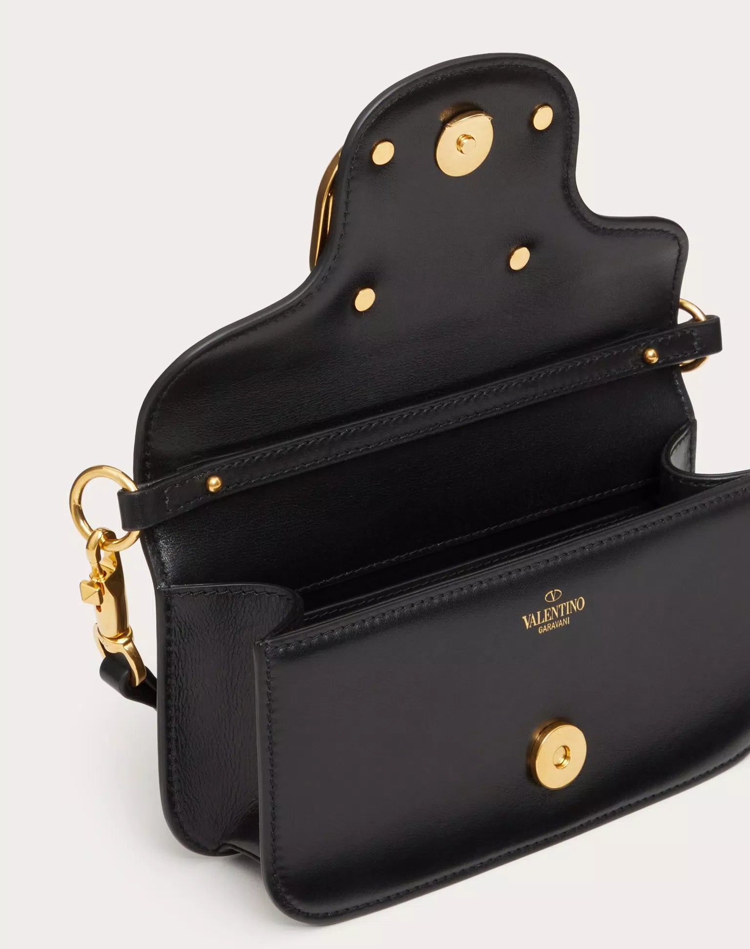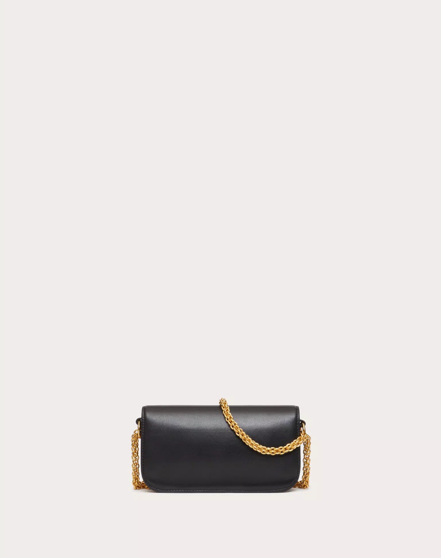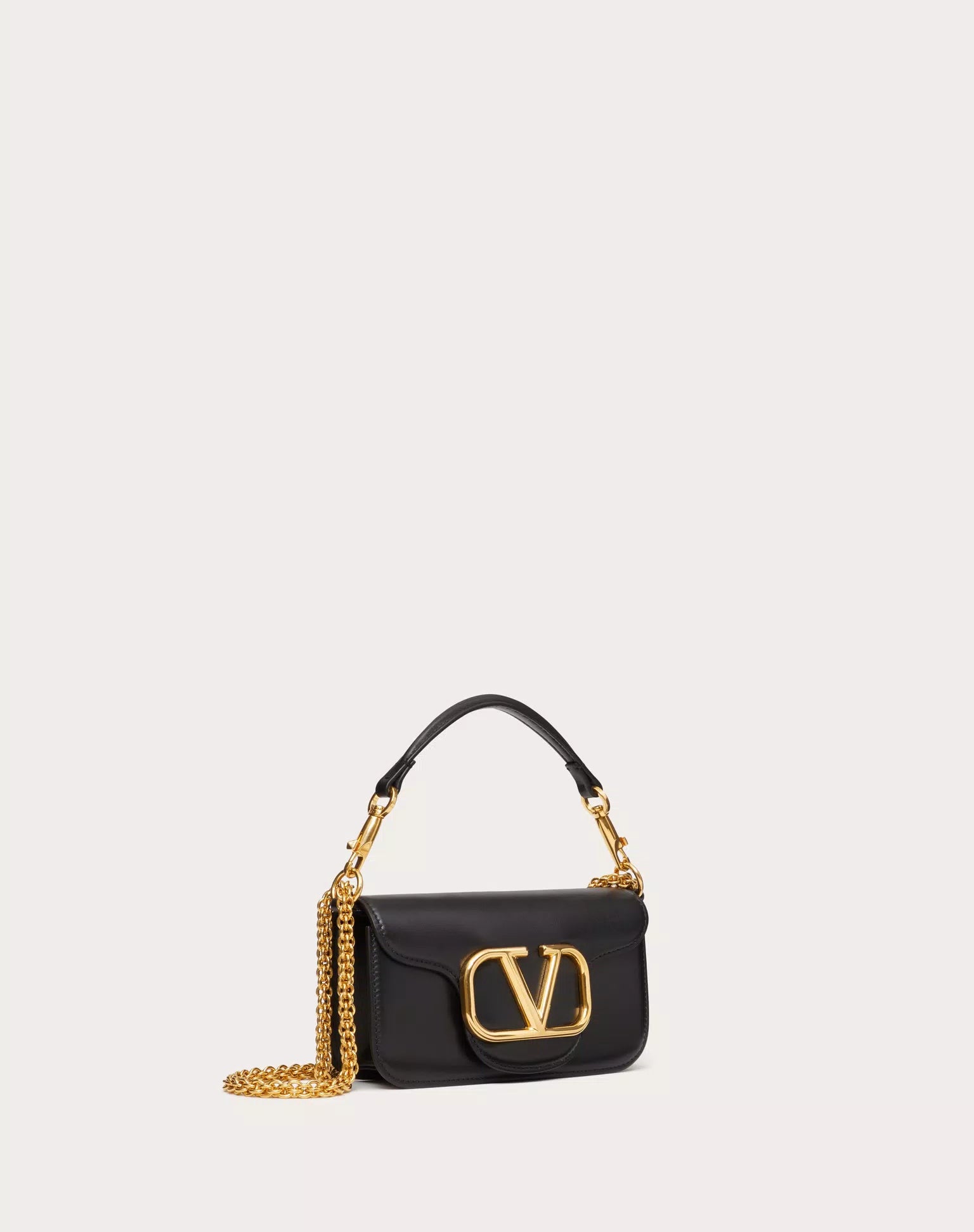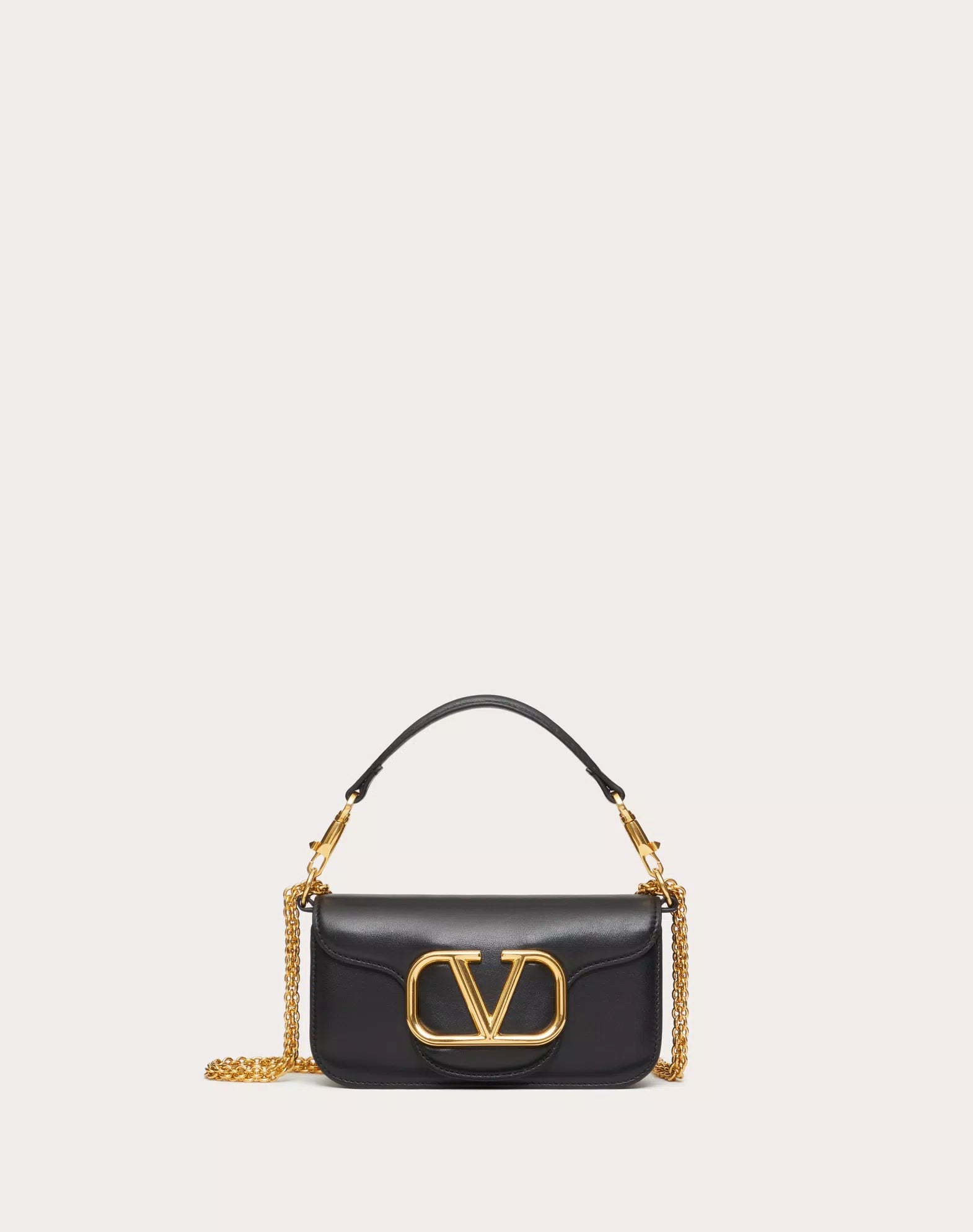 Valentino Garavani Locò women's small shoulder bag in calfskin leather with VLogo Signature metallic element. Equipped with a detachable sliding chain strap and a removable handle, this accessory can be worn as a crossbody/shoulder bag or carried as a handbag.